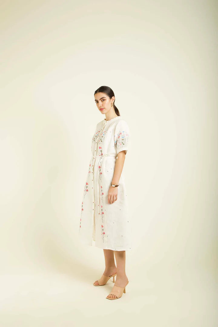 Beige Embroided Drop Shoulder Dress In Gauze Linen
