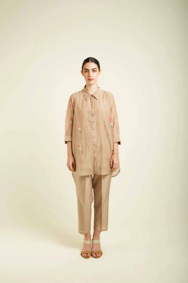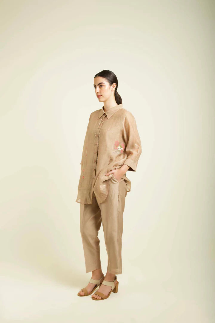Beige Shirt In Mul Chanderi With Straight Pants In Silk Chanderi