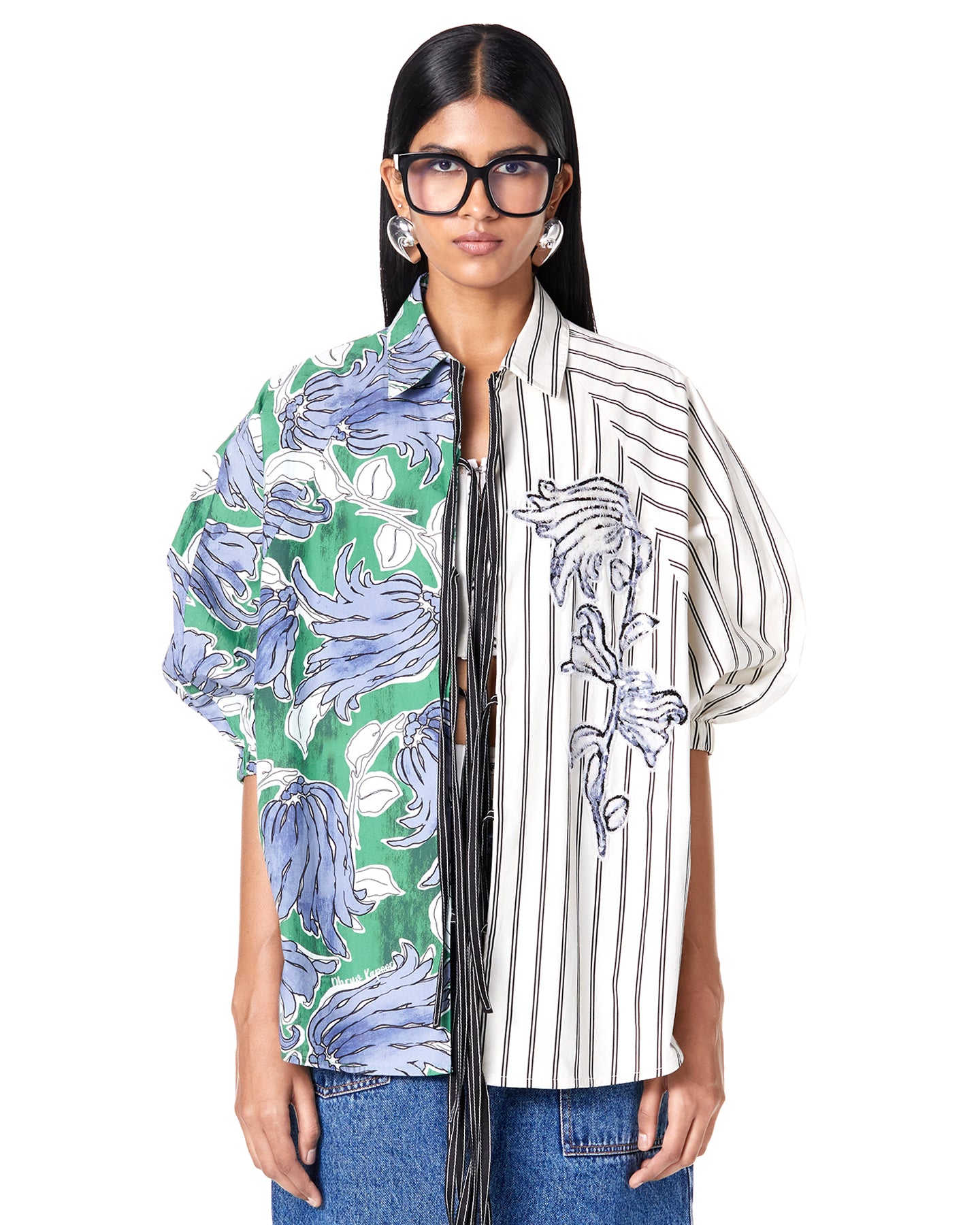 SPLIT PRINT TIE-UP BATWING SHIRT