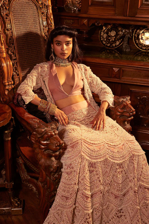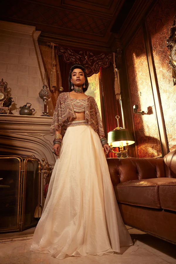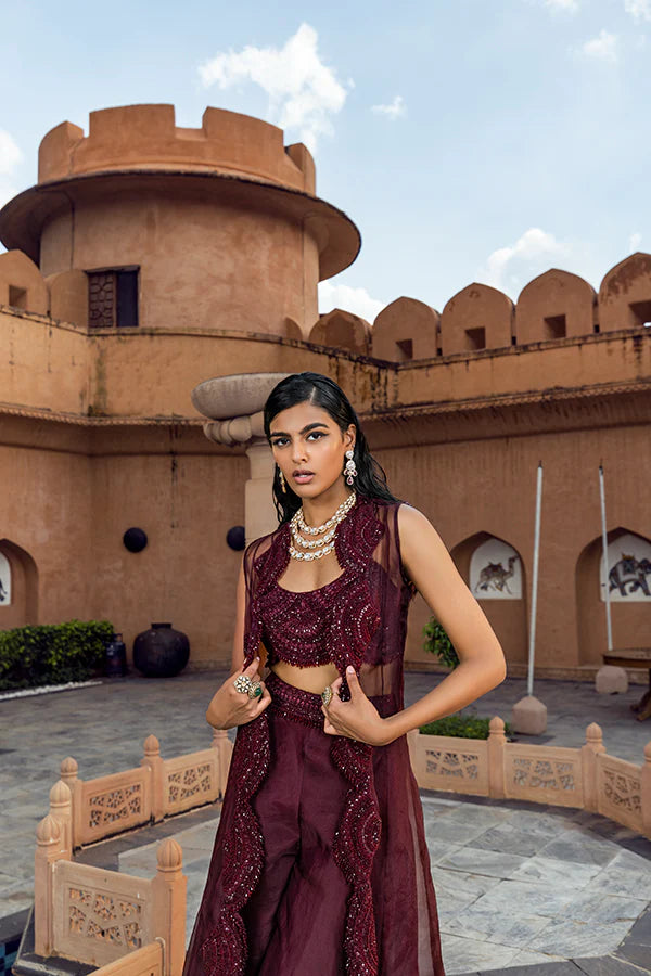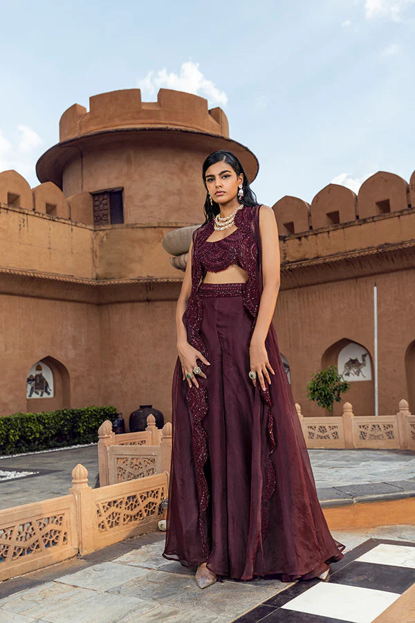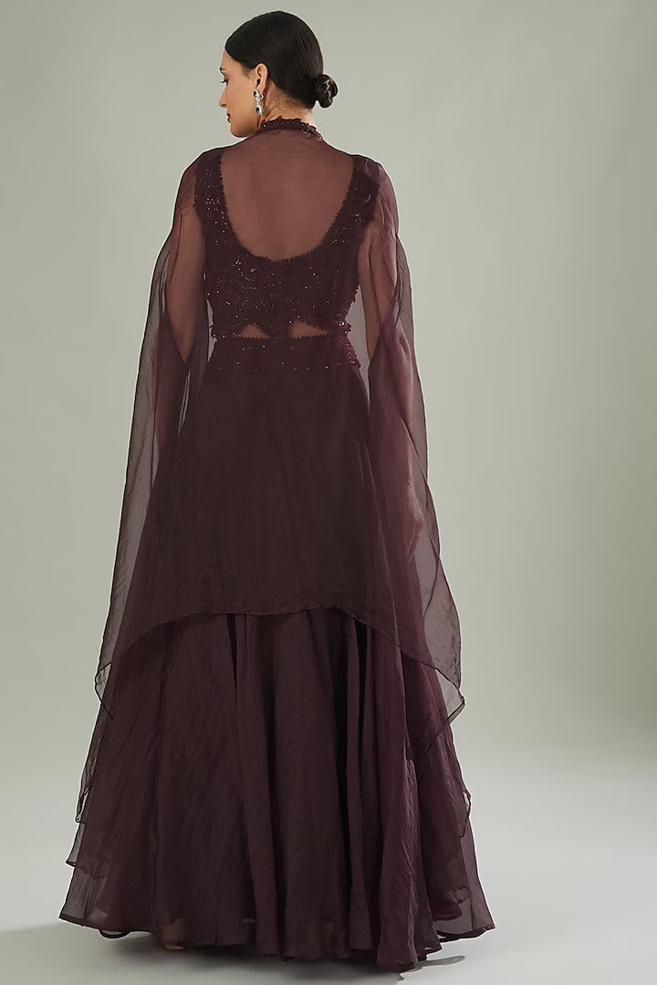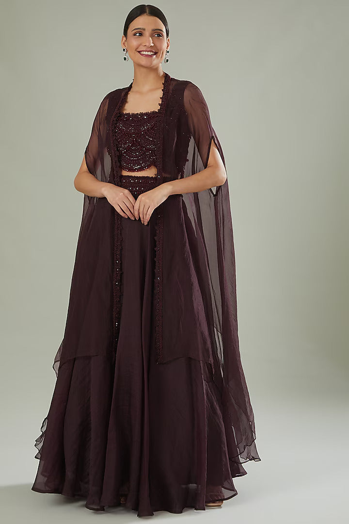 Maroon Organza & Georgette Embellished Jacket Lehenga Set