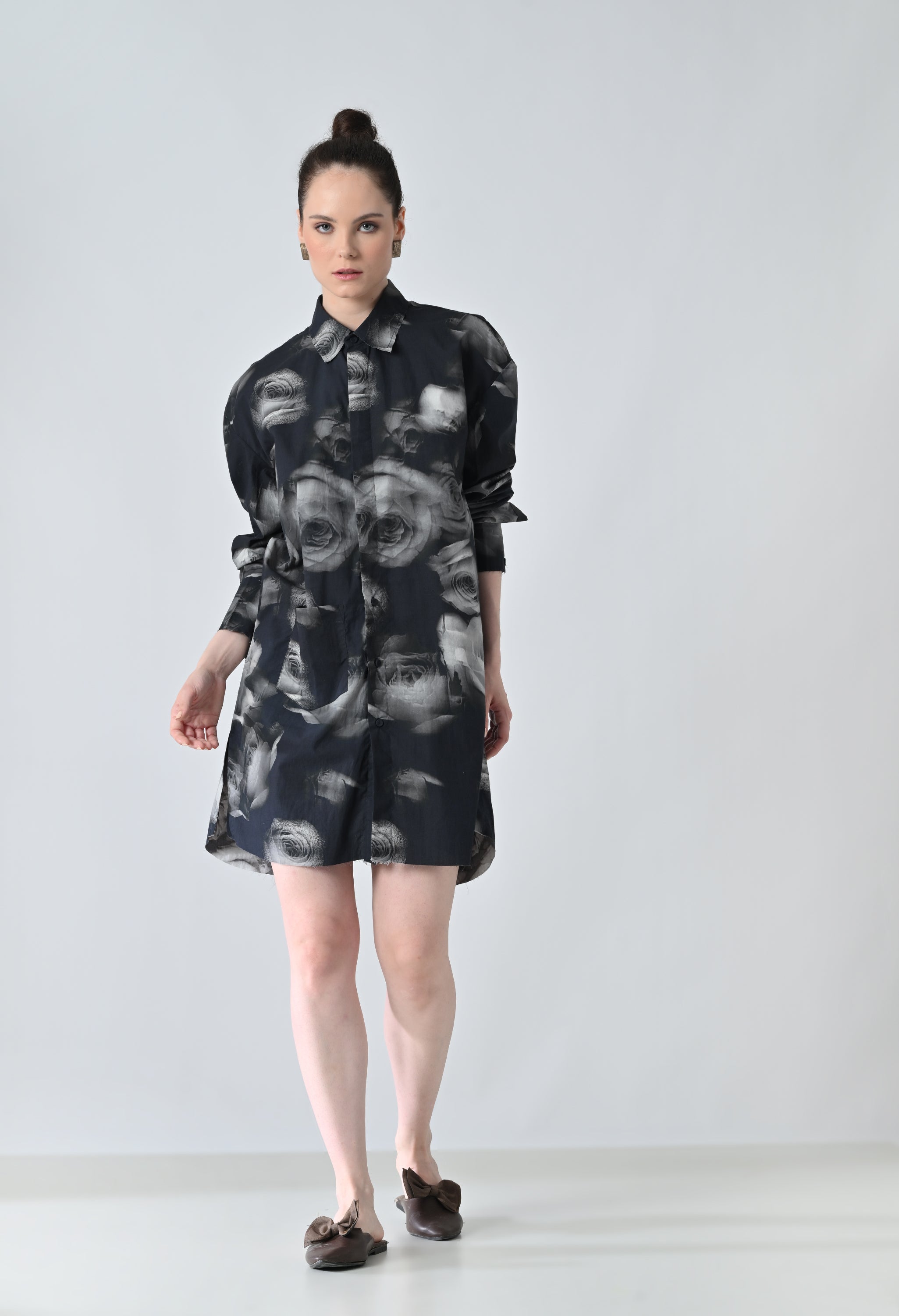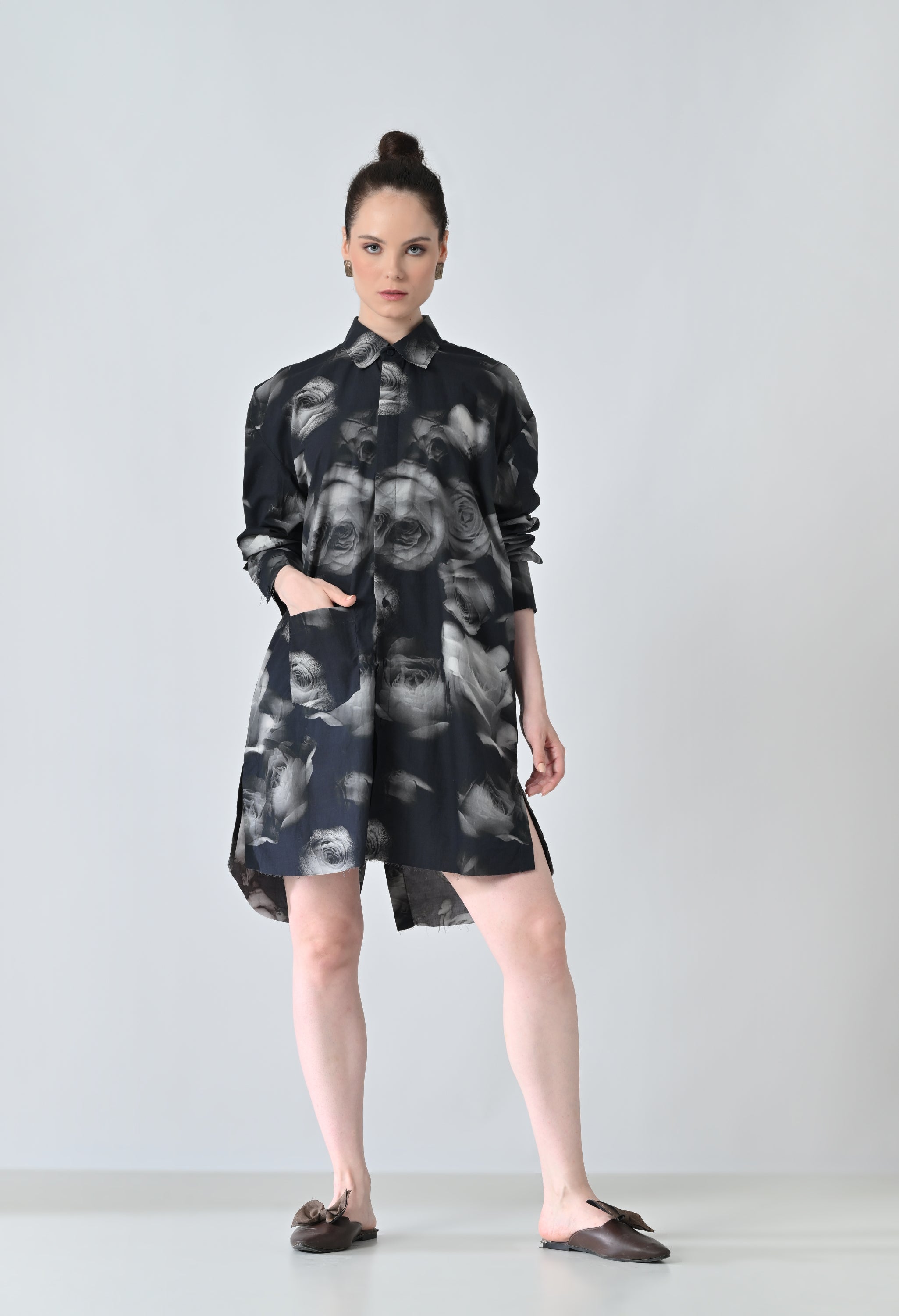 Black Blur Rose Printed Long Shirt