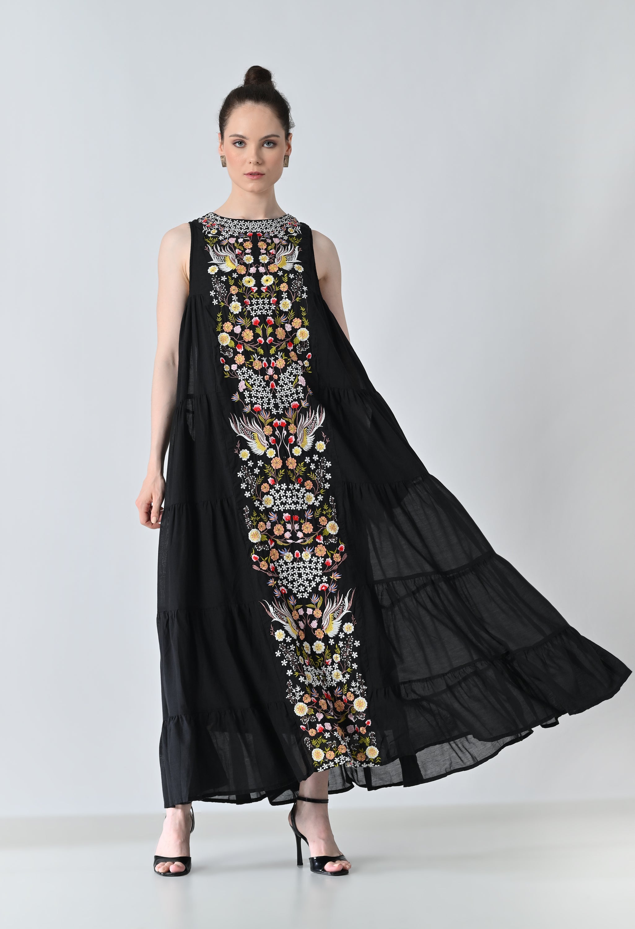 Black Embroidered Tiered Long Dress