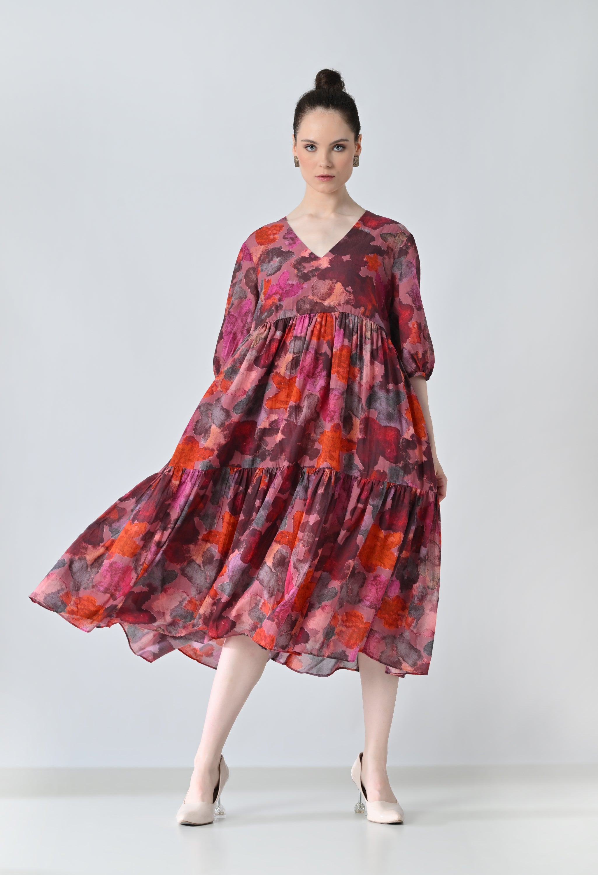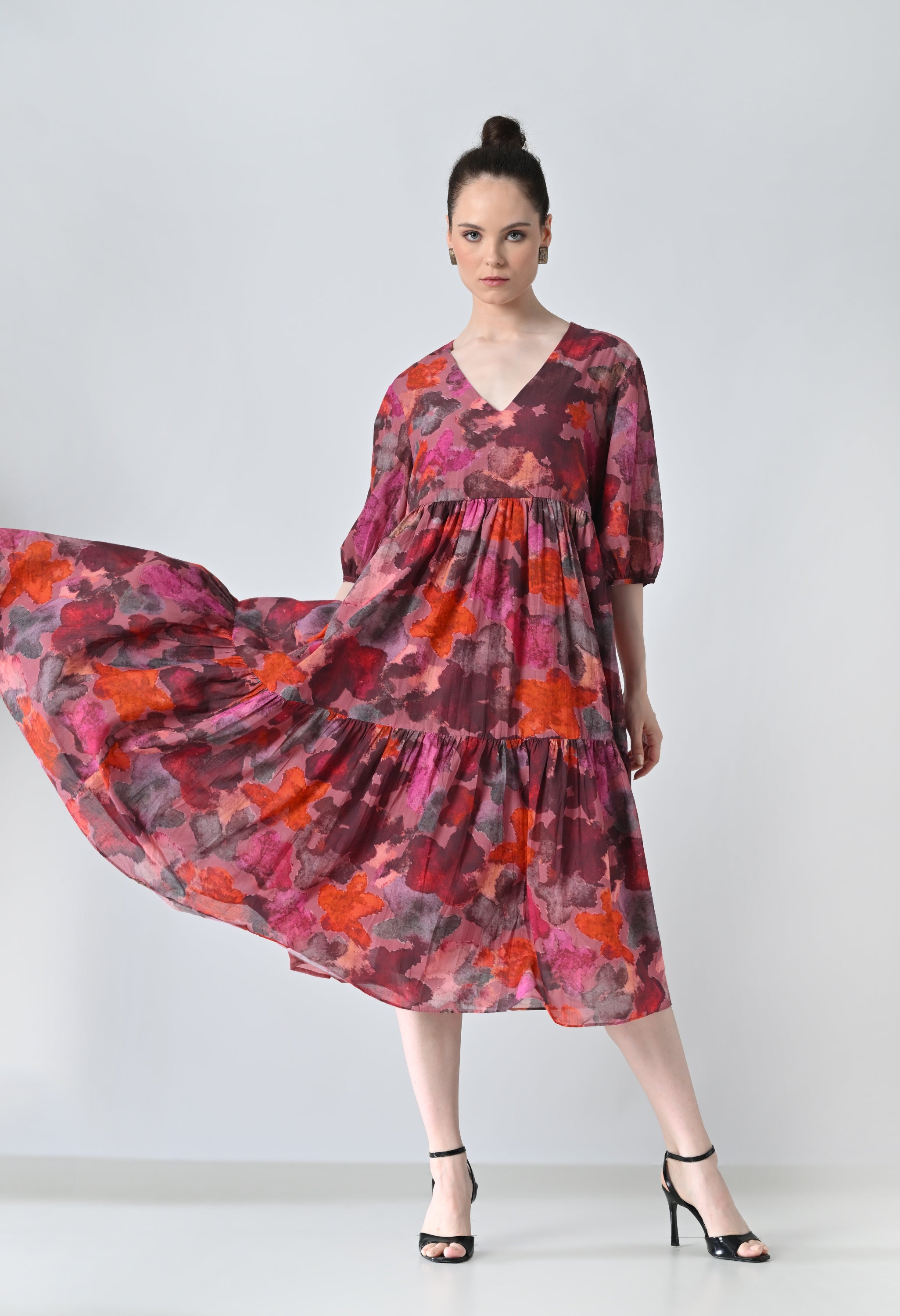 Crimson Red Bloom Multi Printed Tiered Dress