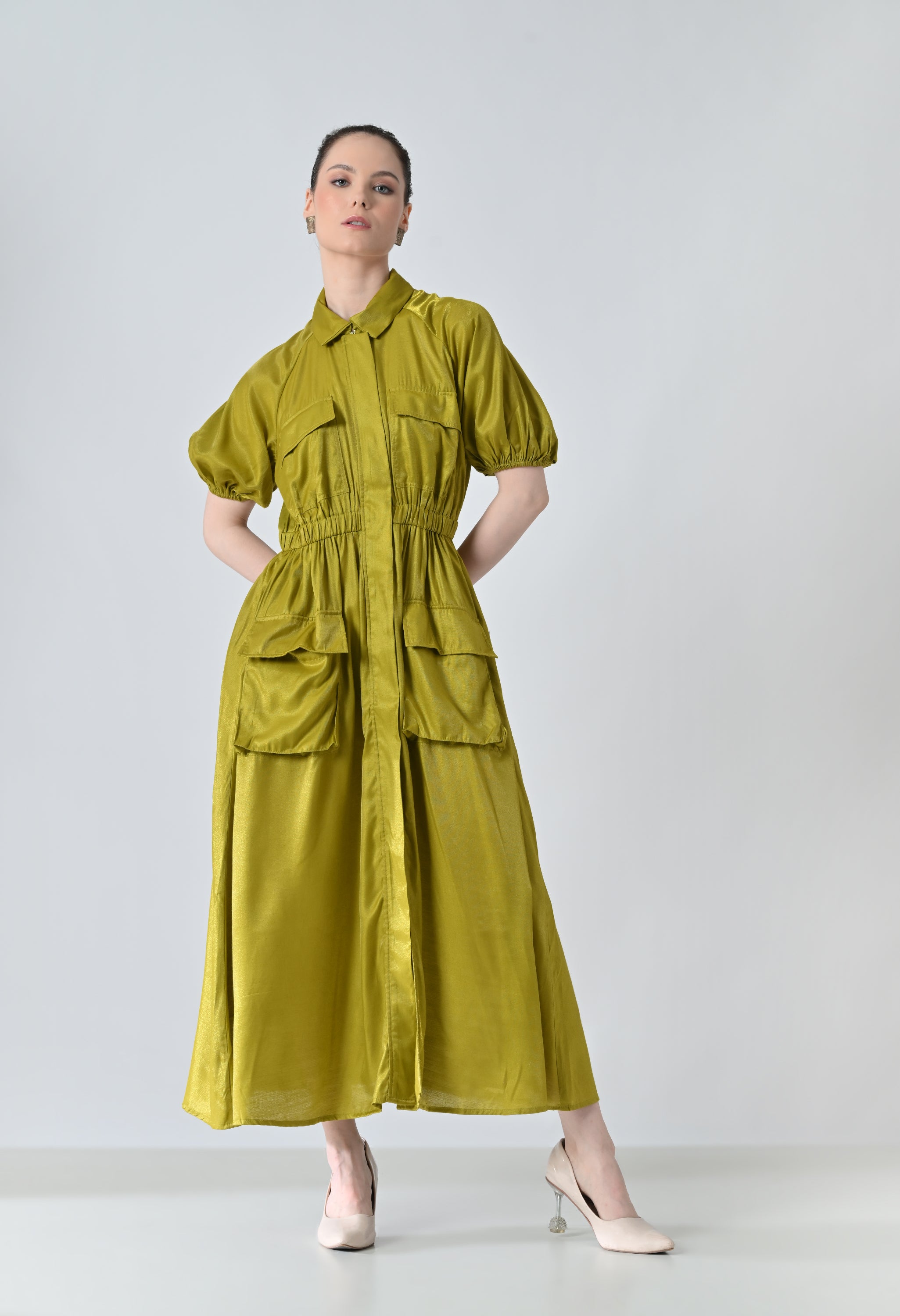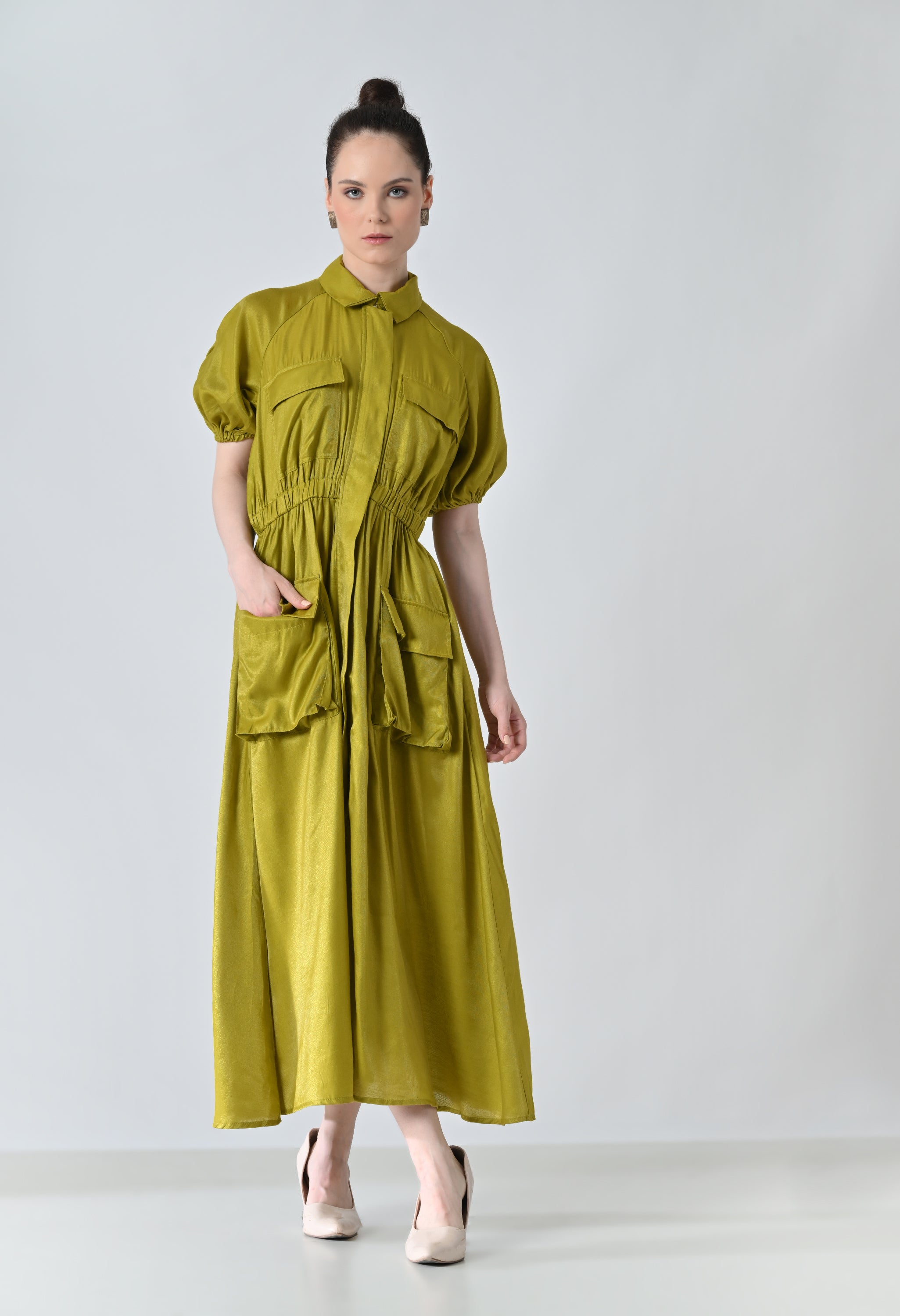 Olive Gathered Utility Dress With Pockets