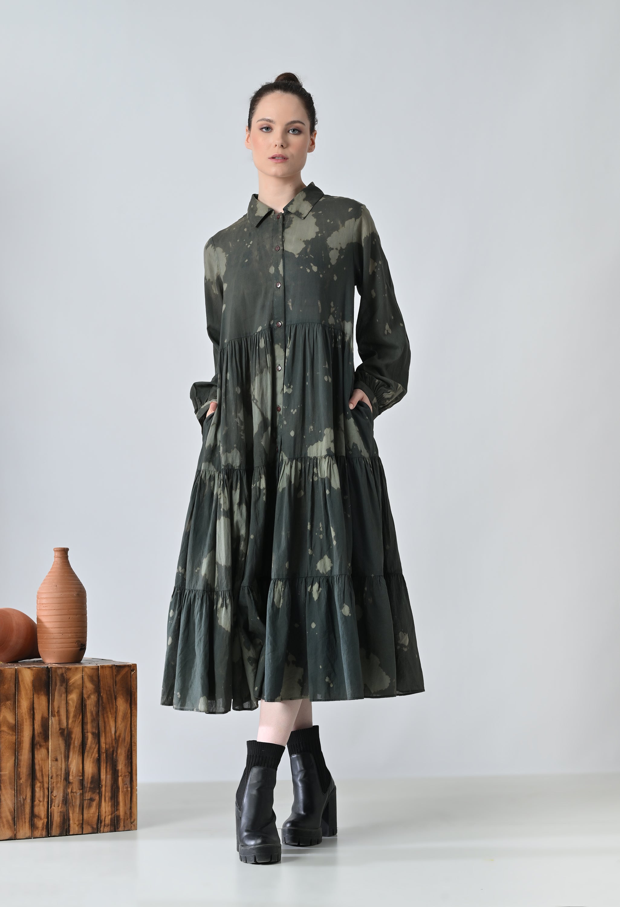 Forest Green Printed Tiered Shirt Dress