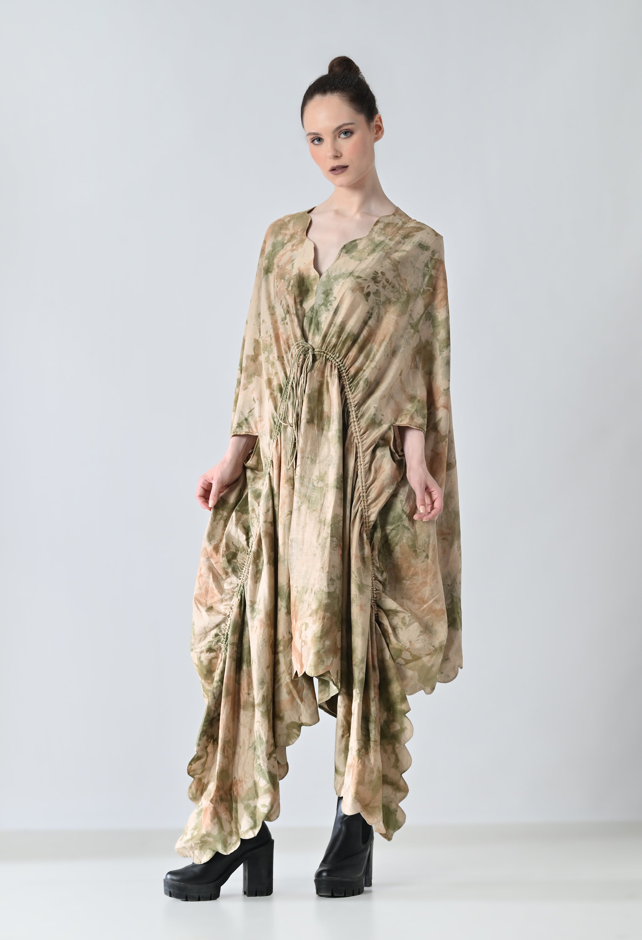 Desert Beige Drape Gathered Printed Kaftan Dress
