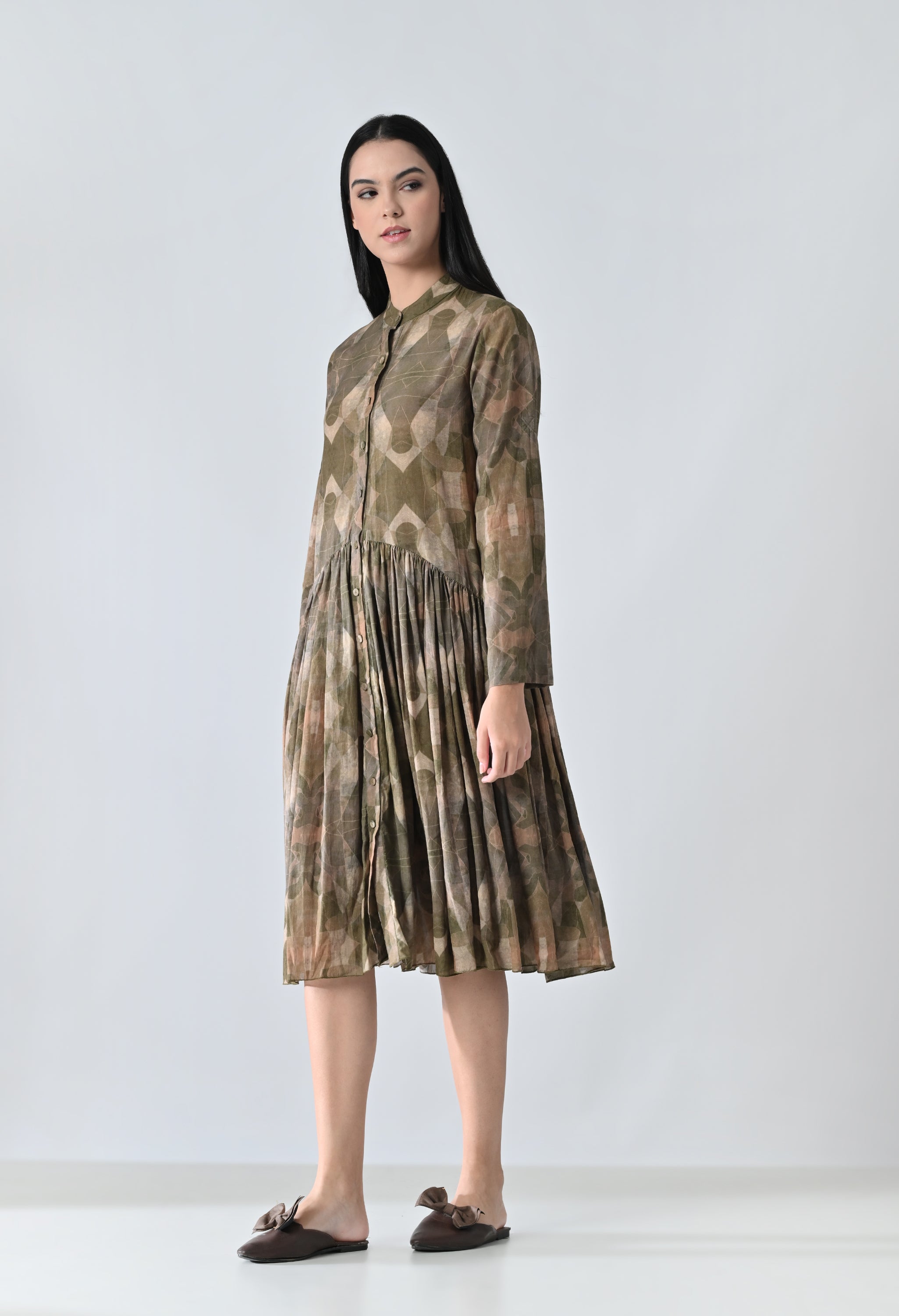 Olive Meadow Pleated Printed Dress