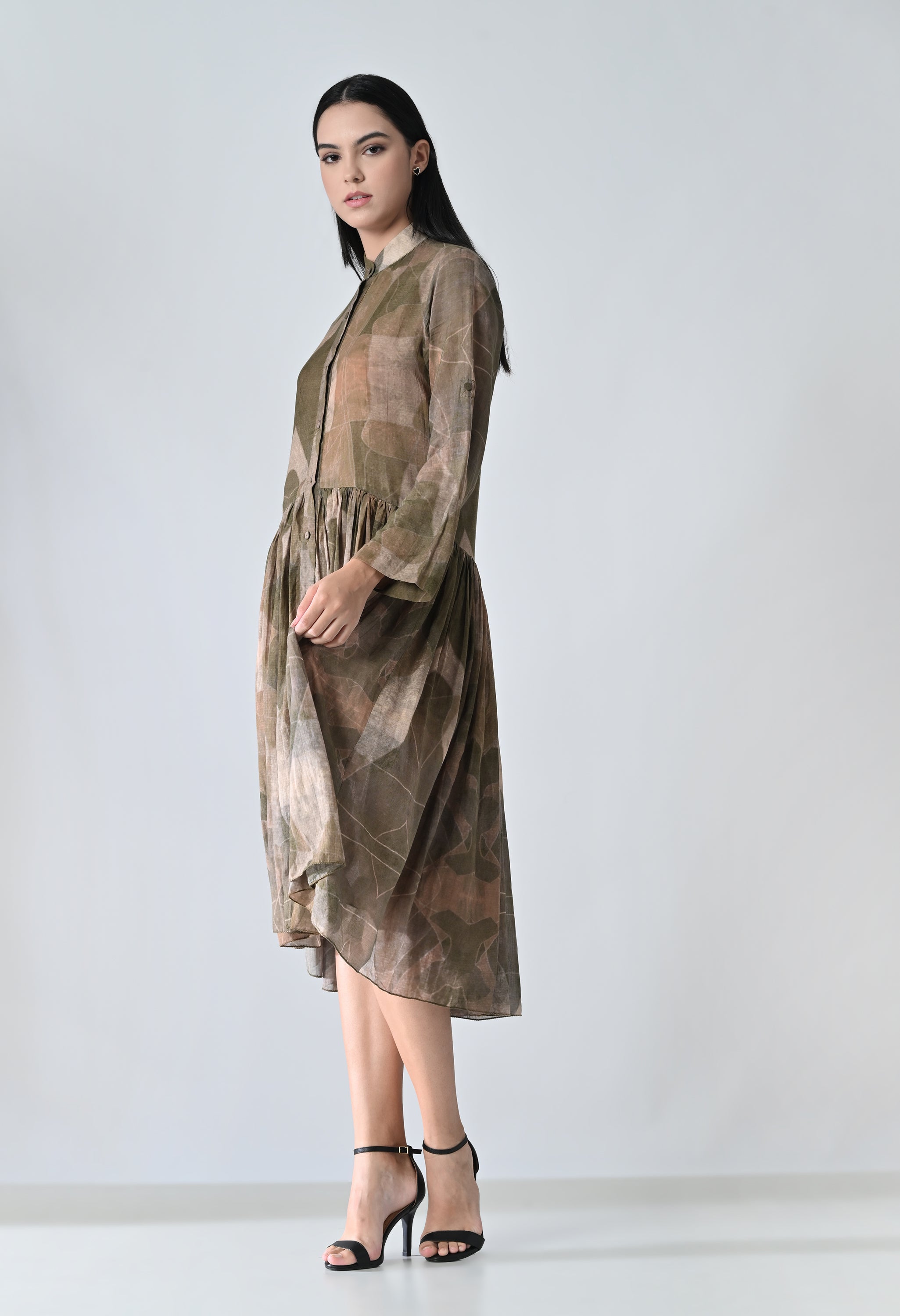 Olive Green Drift Printed High Low Gathered Dress