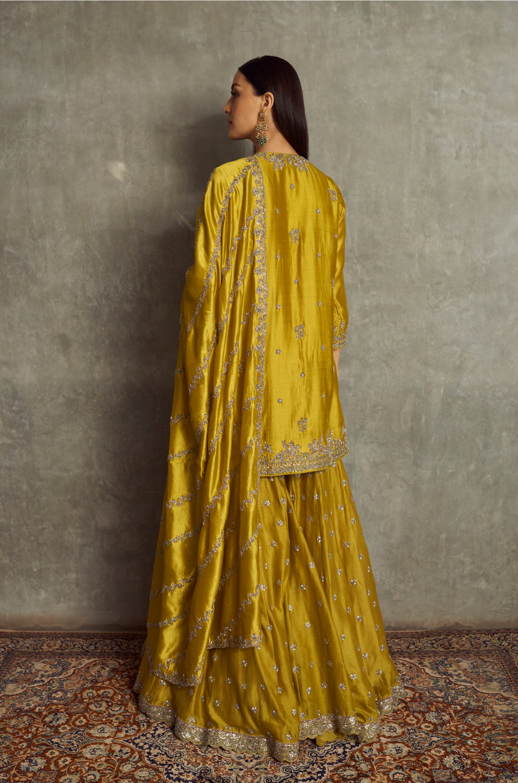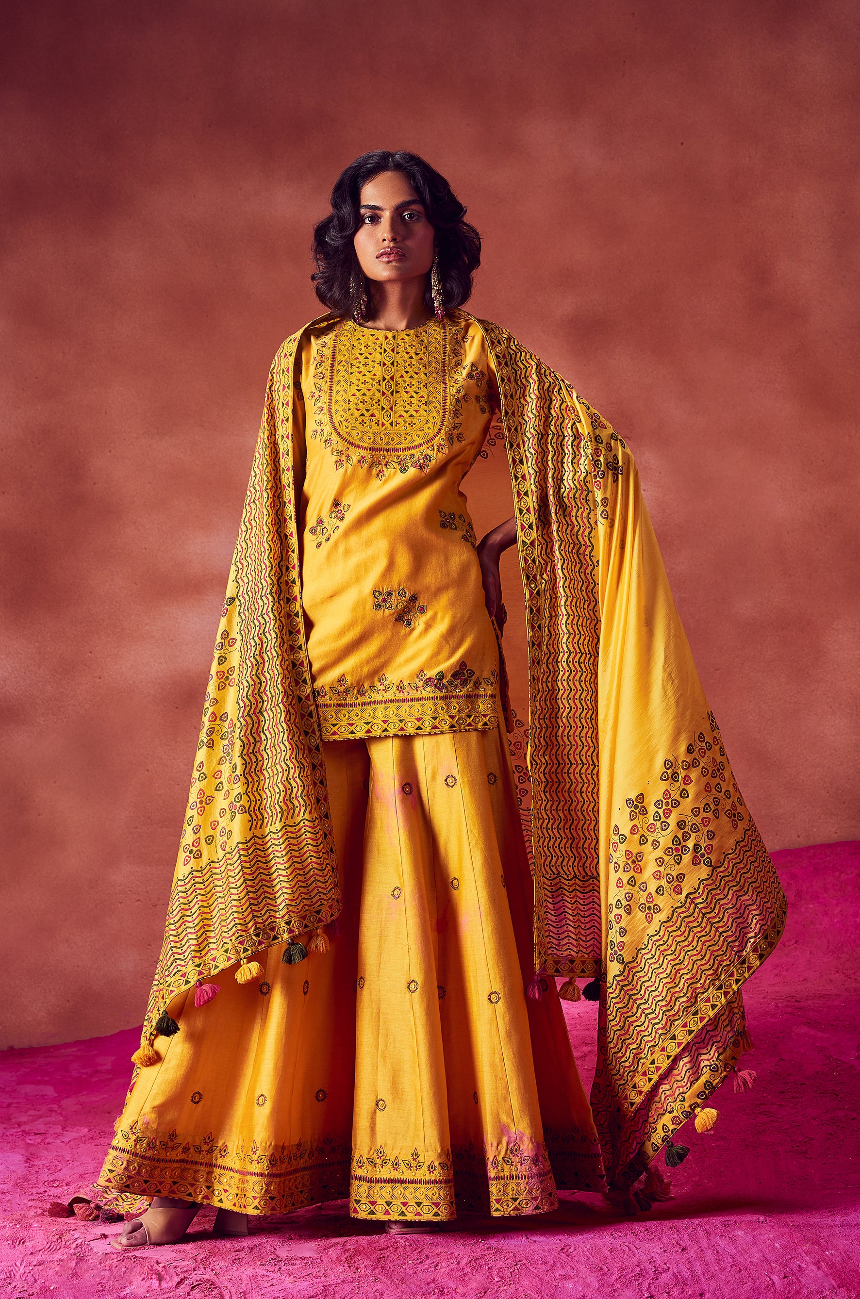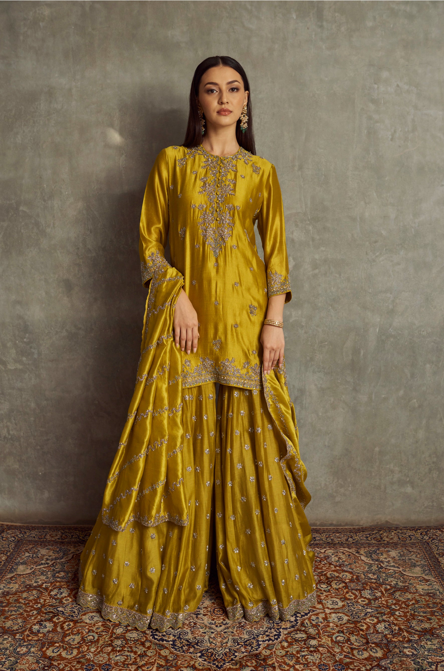 Velvet patchwork short kurta with Sharara pants & dupatta.