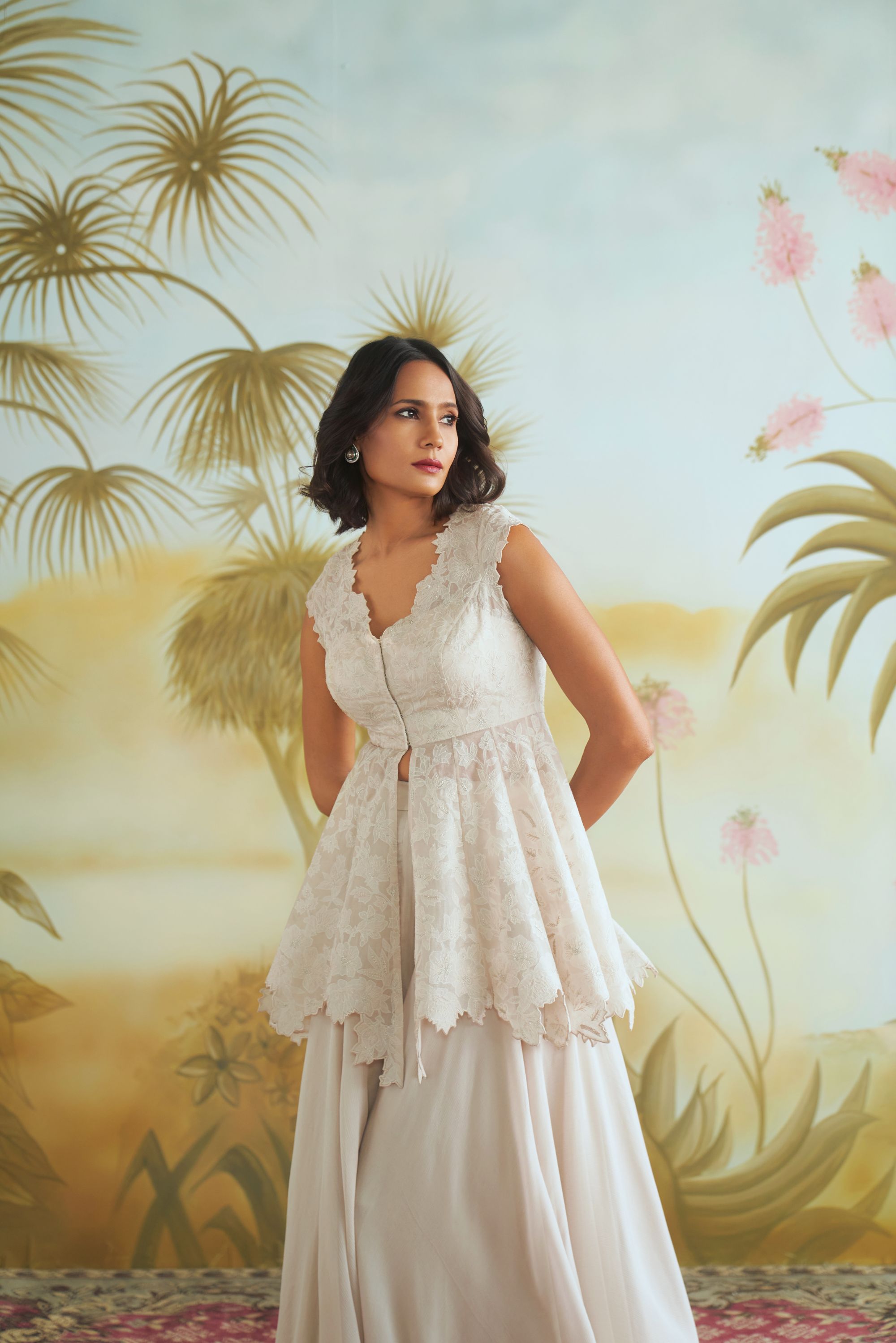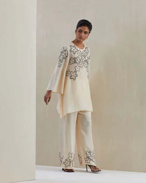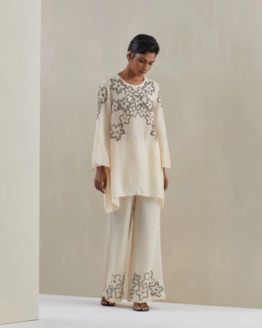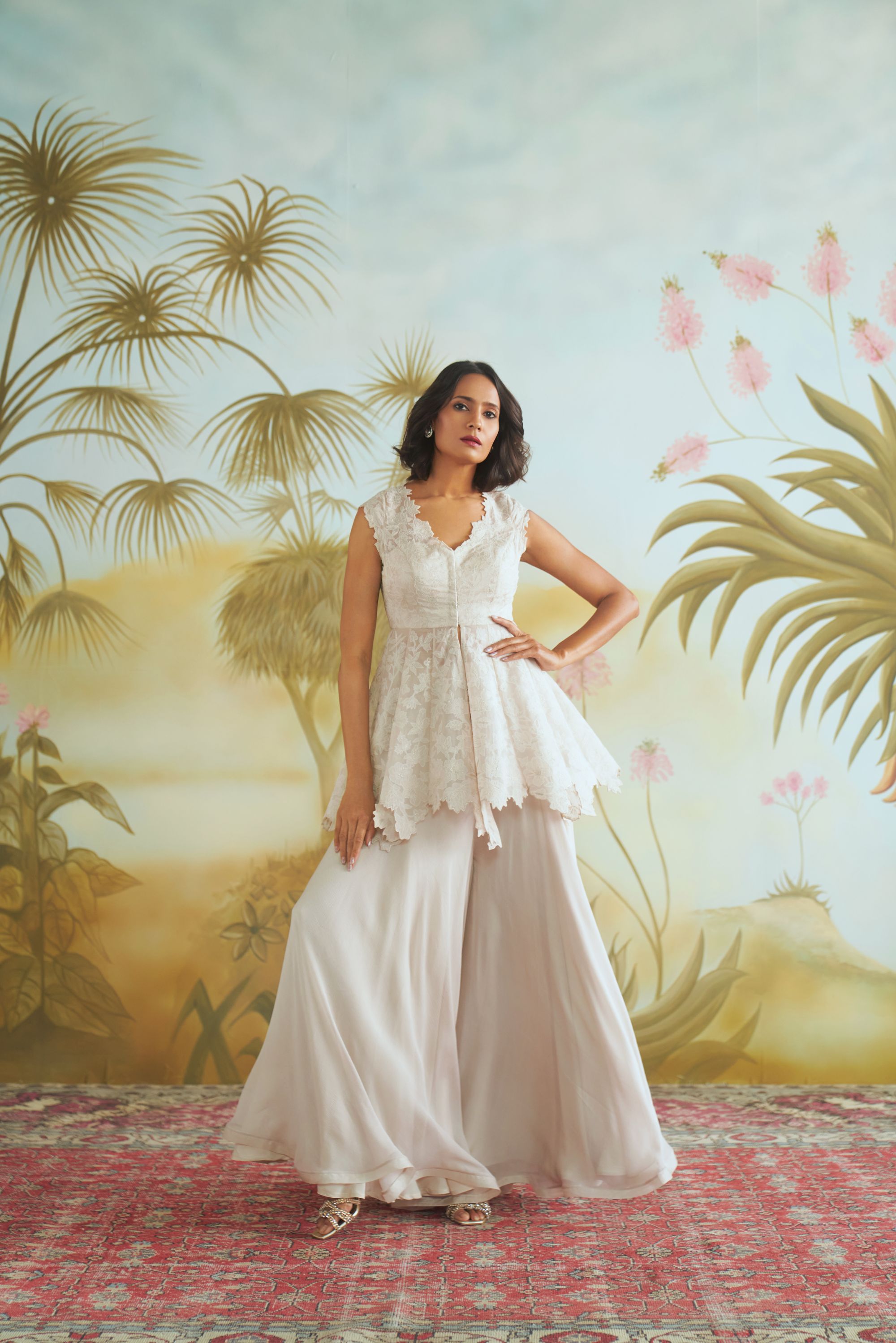 Velvet patchwork short kurta with Sharara pants & dupatta.