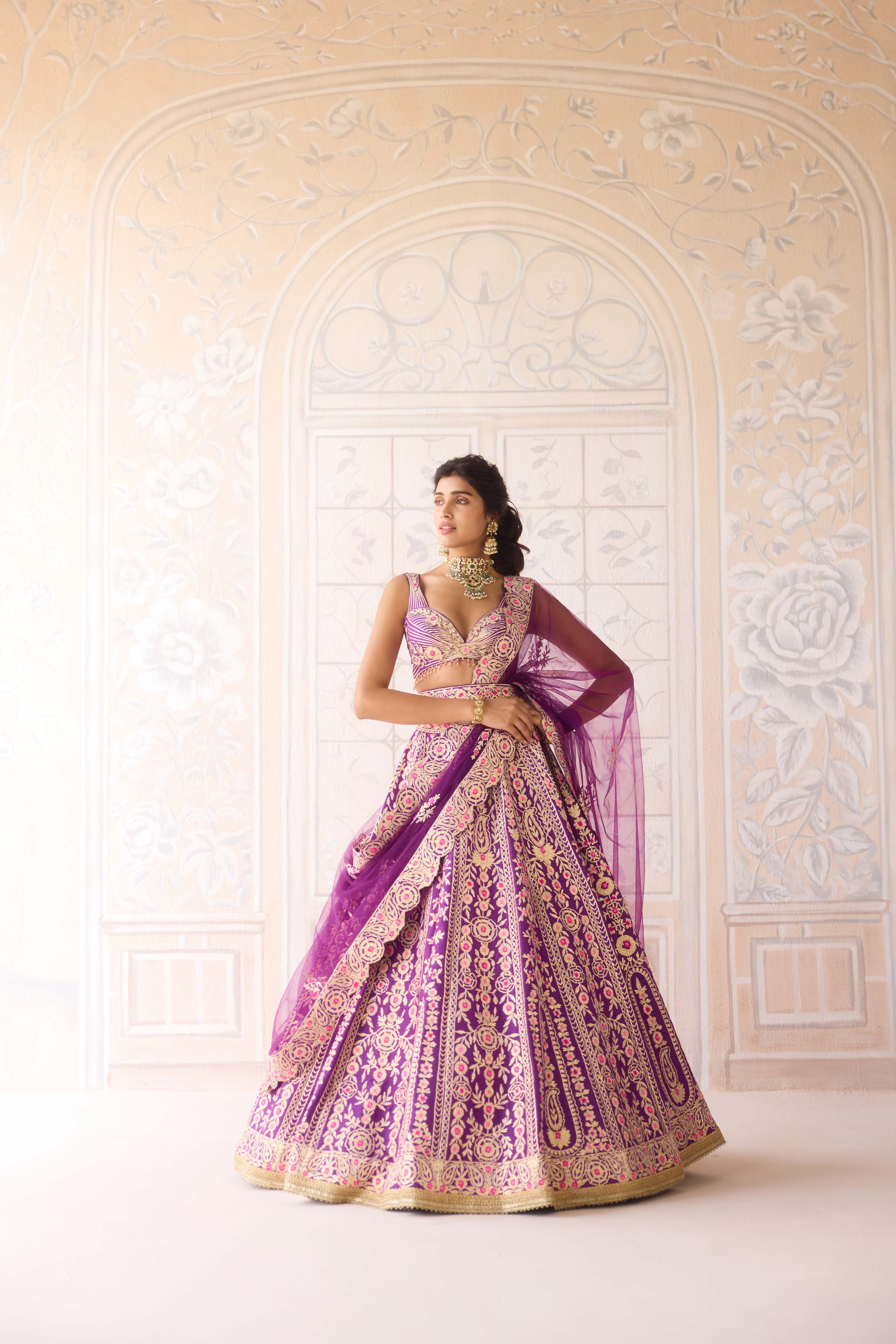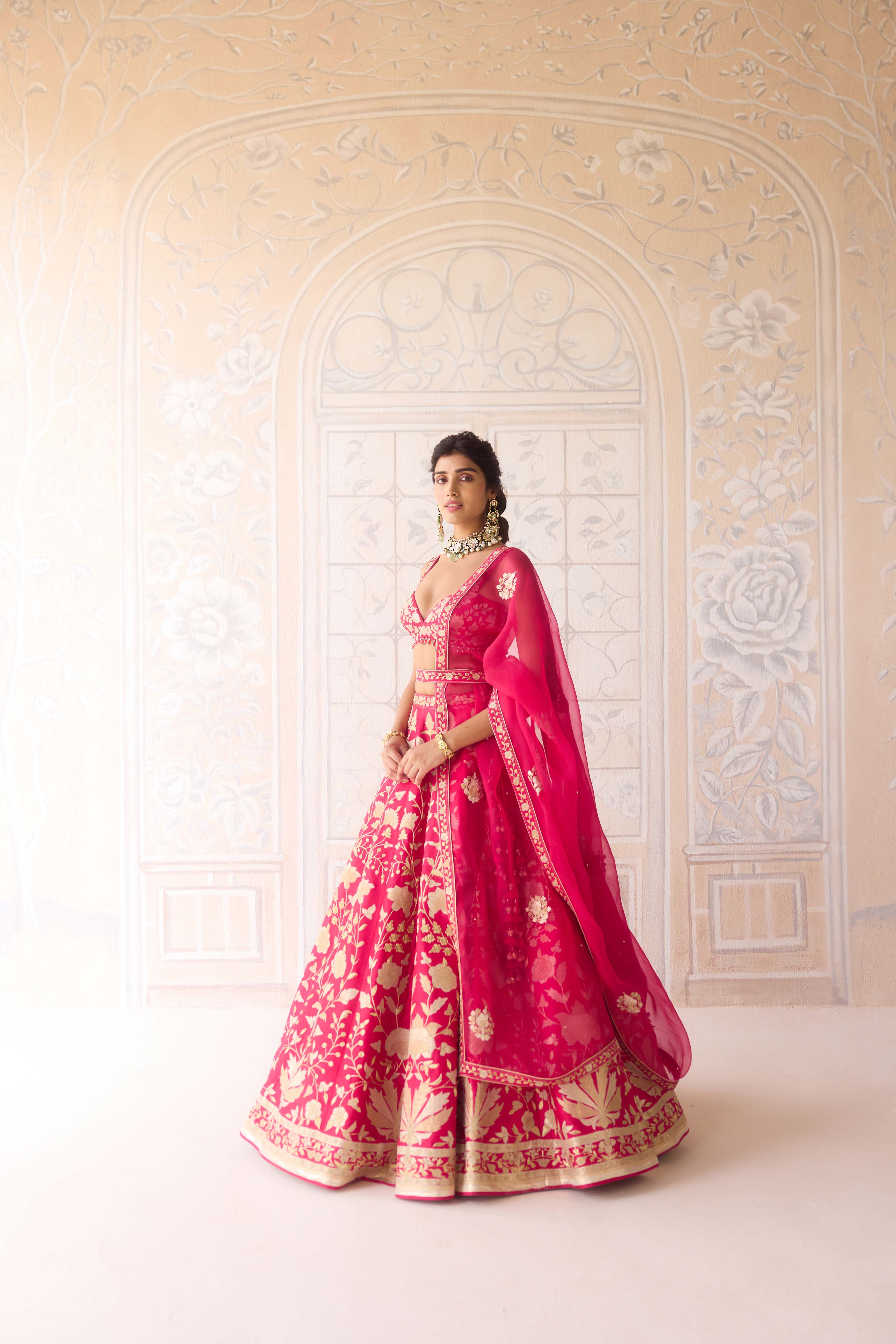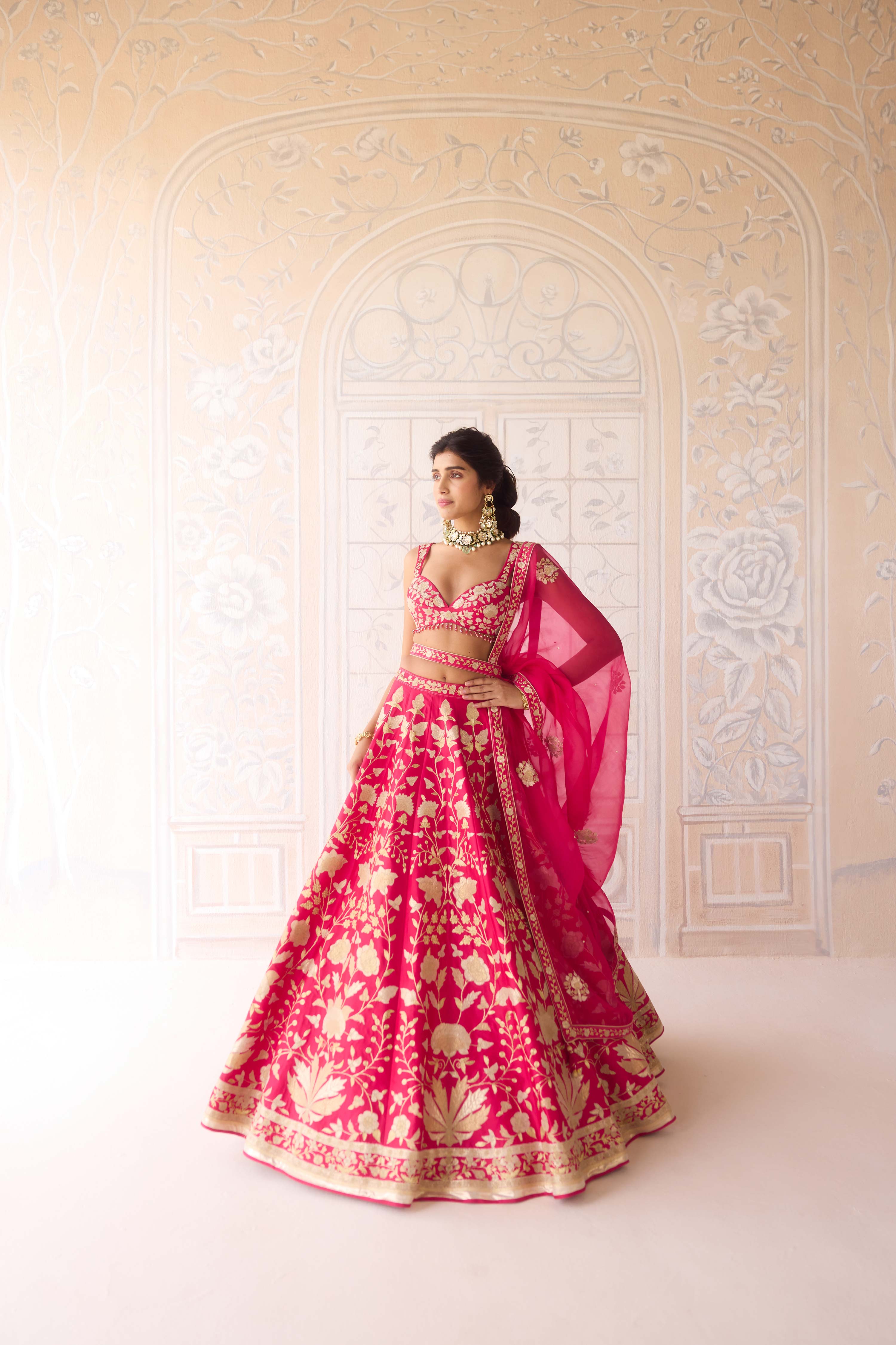 Raw silk carmine rose pink gold applique and dori embroidered lehenga set with organza dupatta