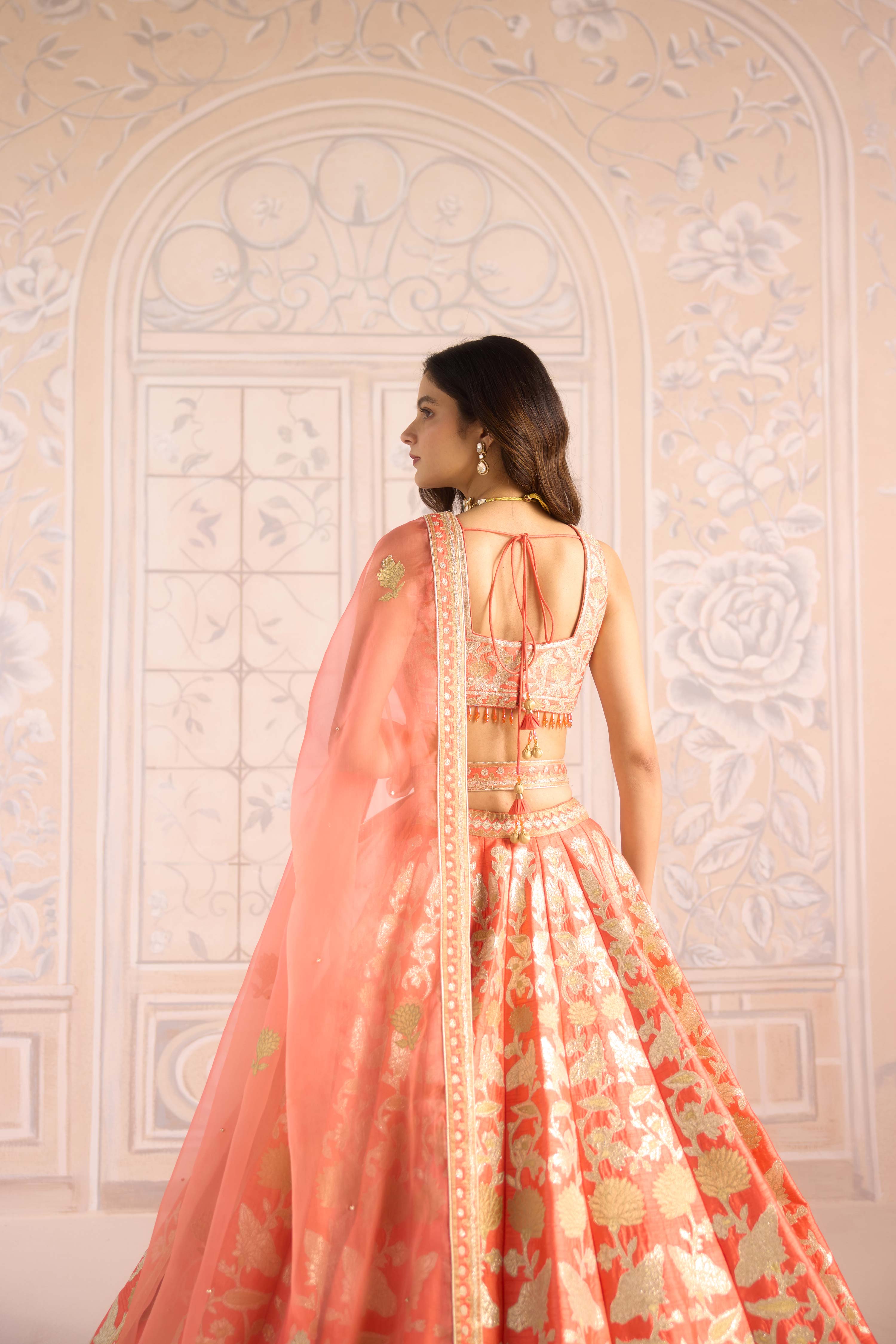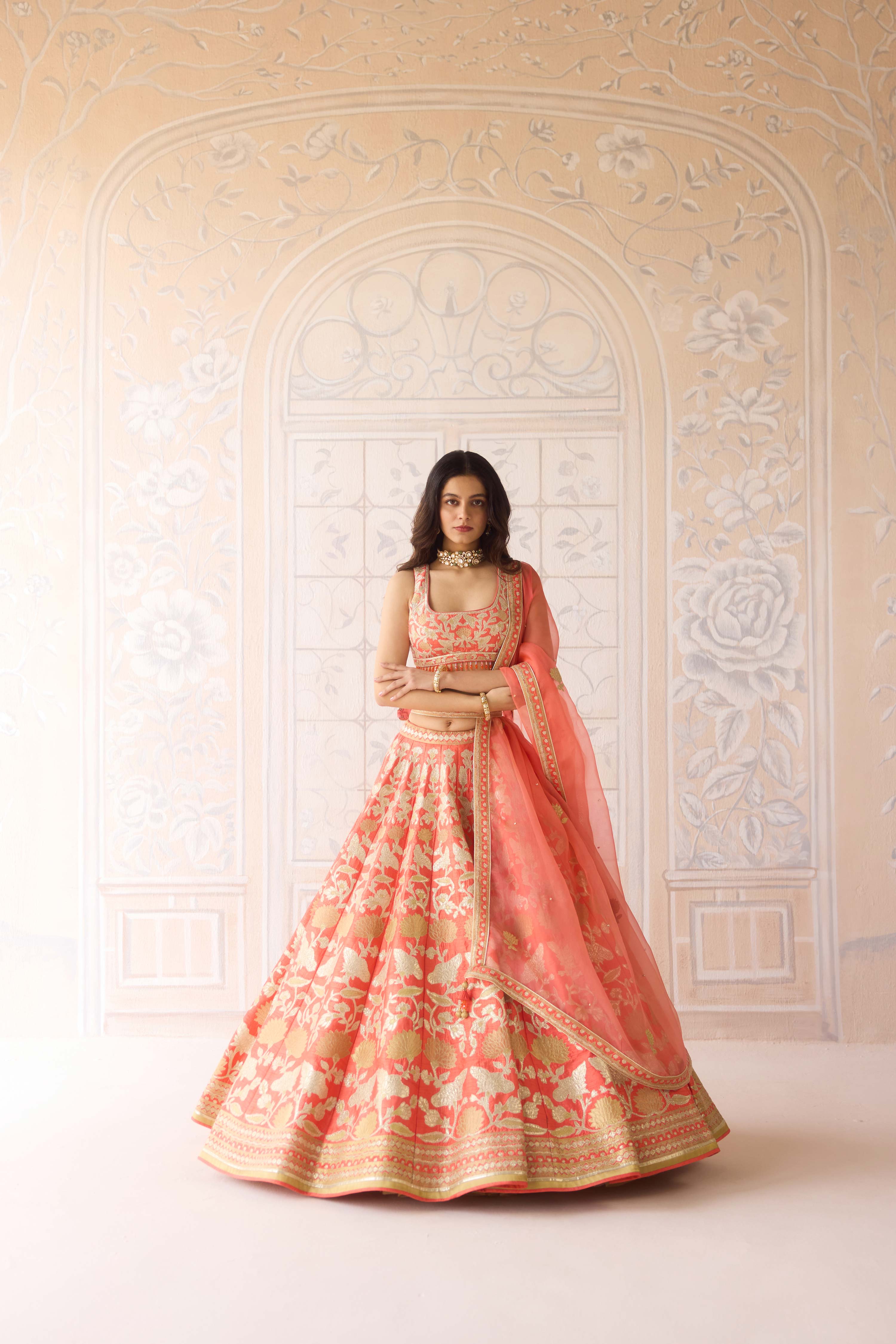 Raw silk coral orange gold applique embroidered lehenga set with organza dupatta