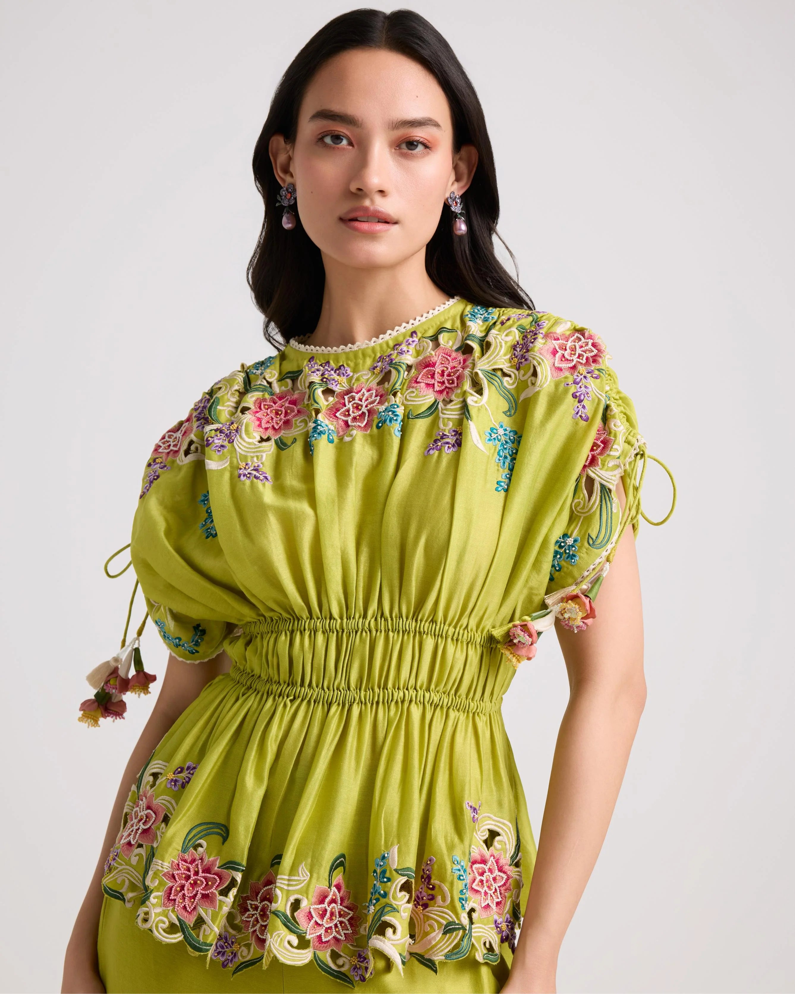 Lime Green Floral Cutwork Ruched Top