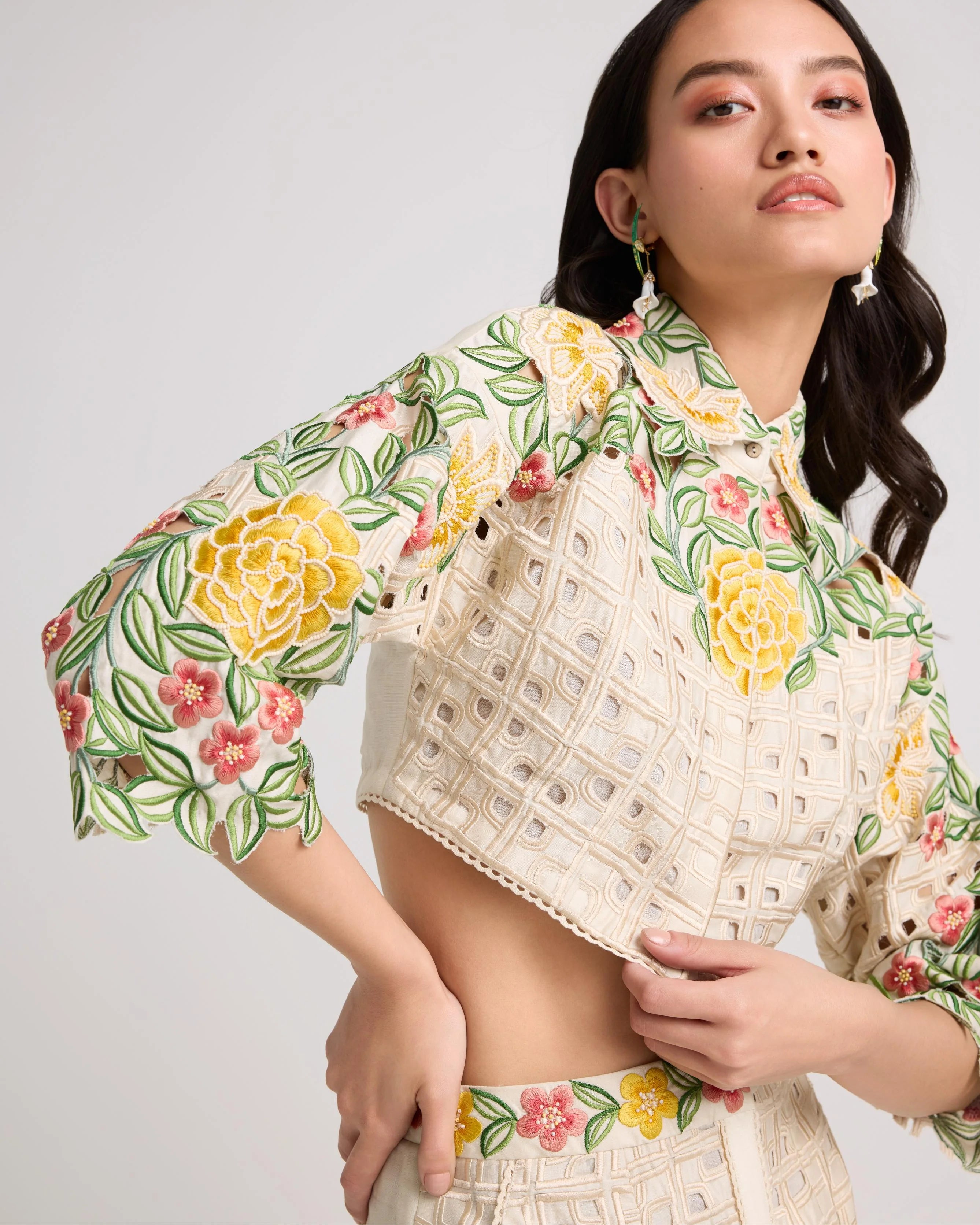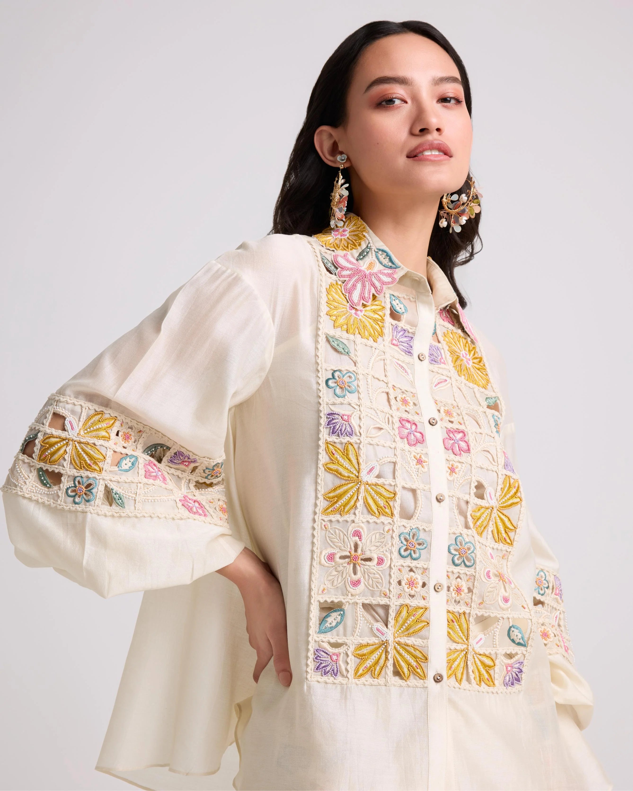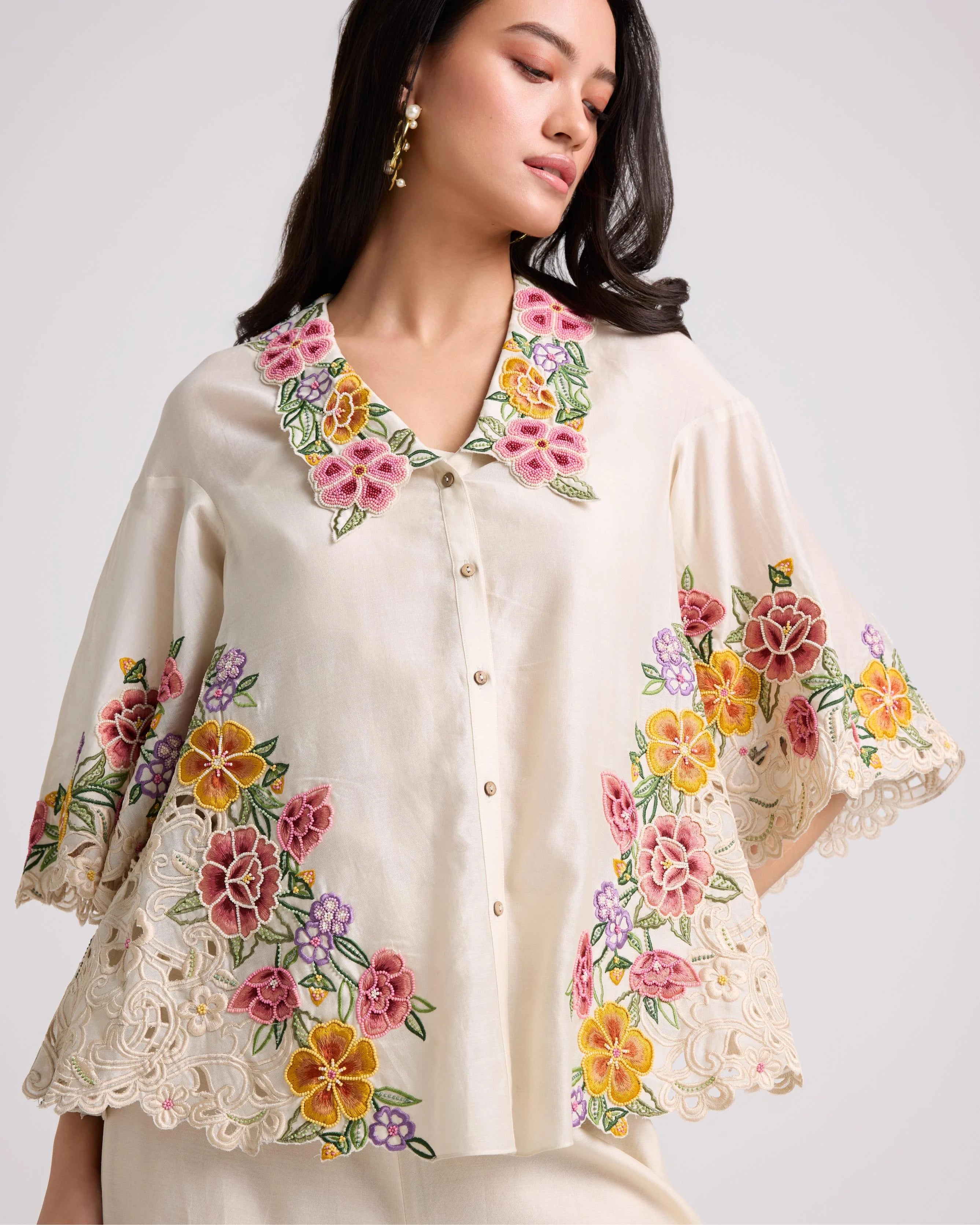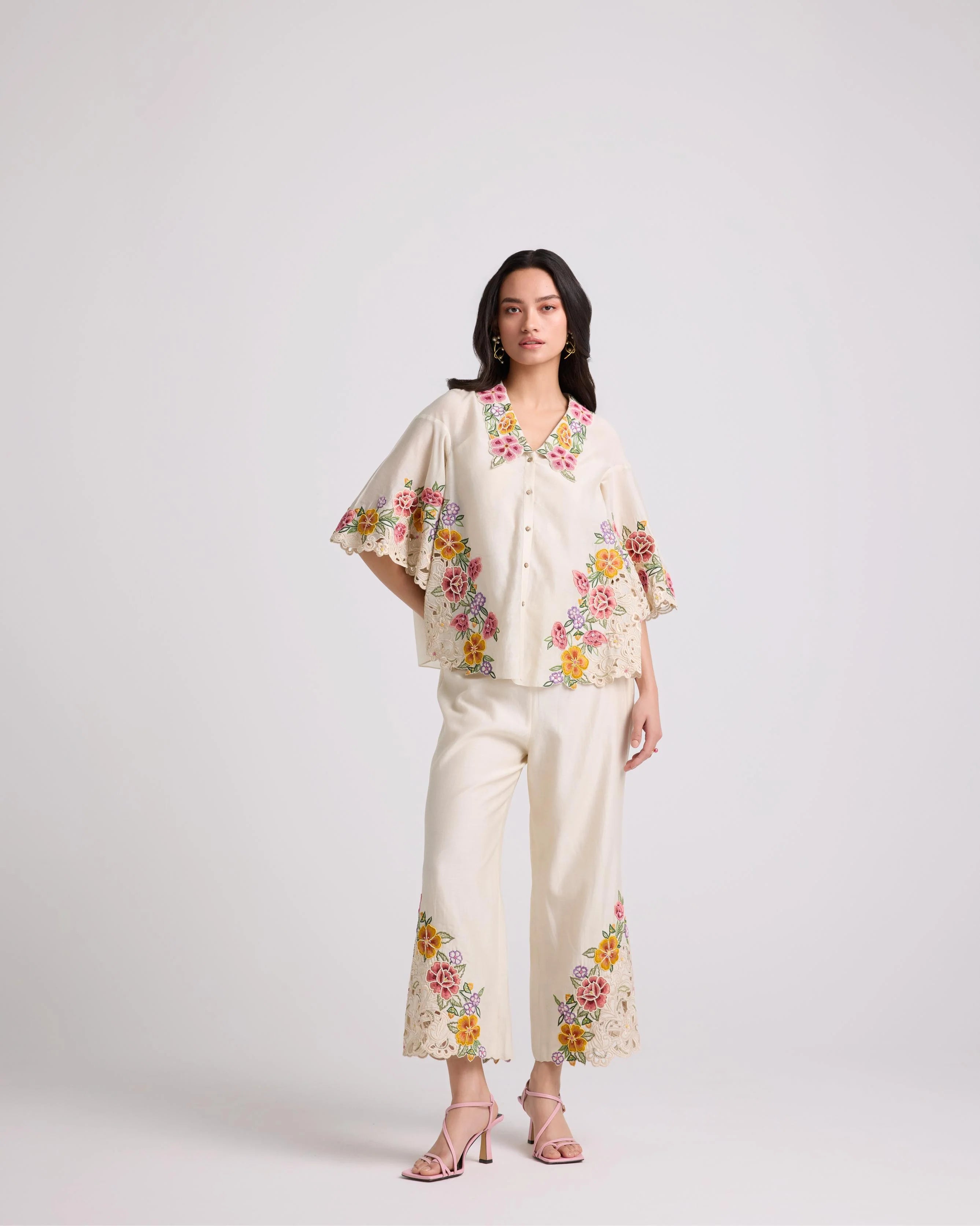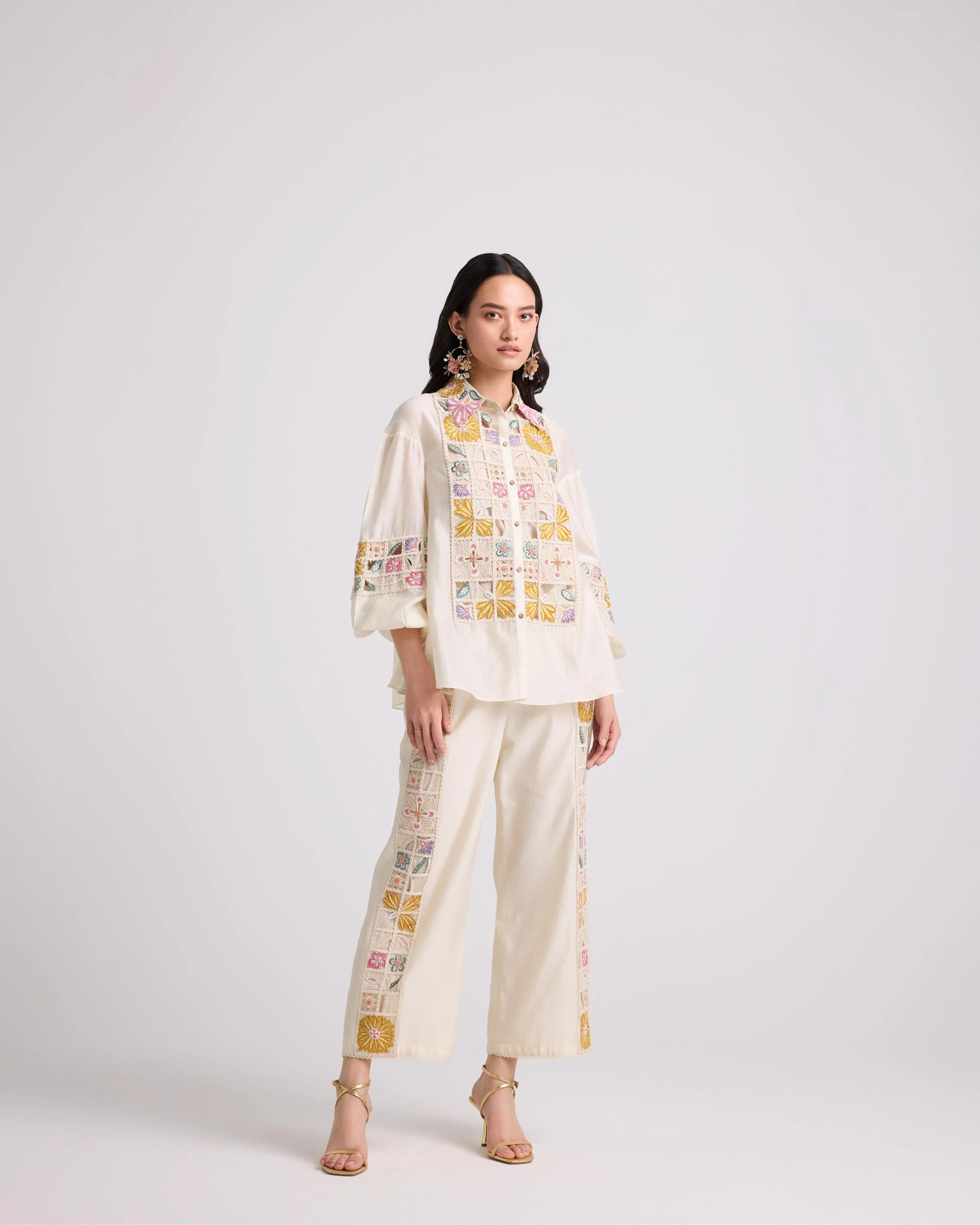 Ivory Floral Cutwork Shirt With Pants