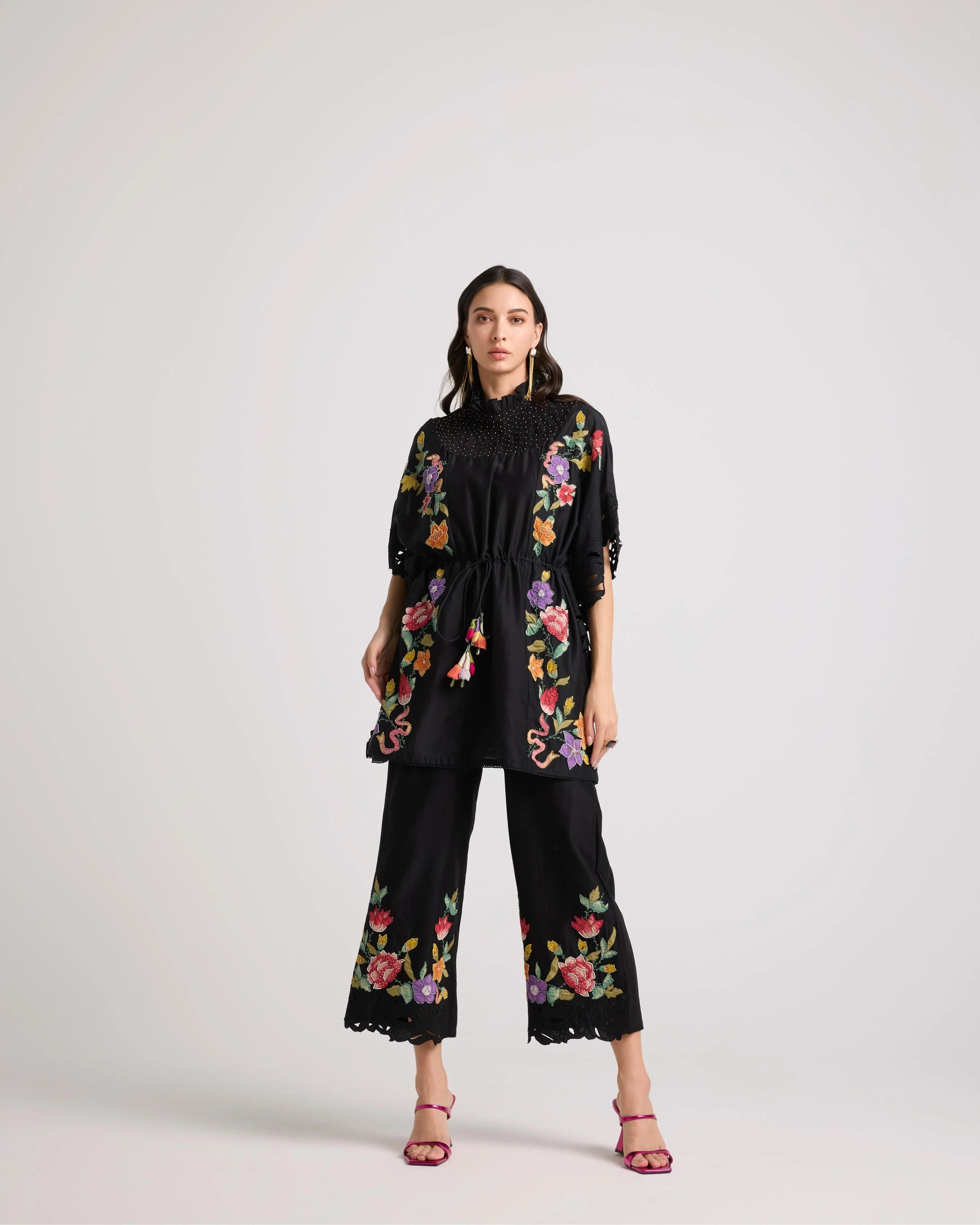 Black Floral Embroidered Flared Pants