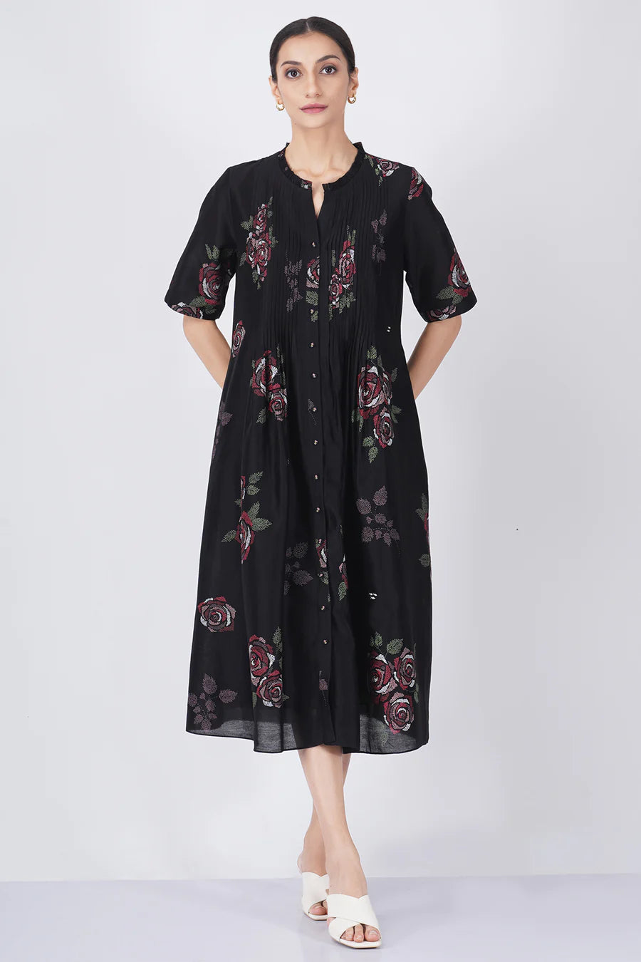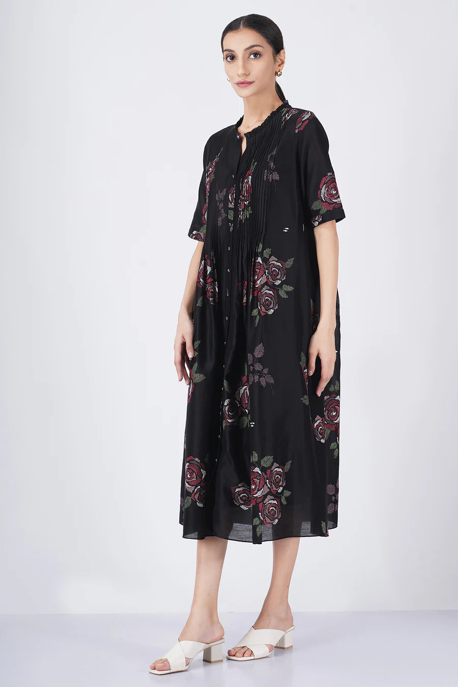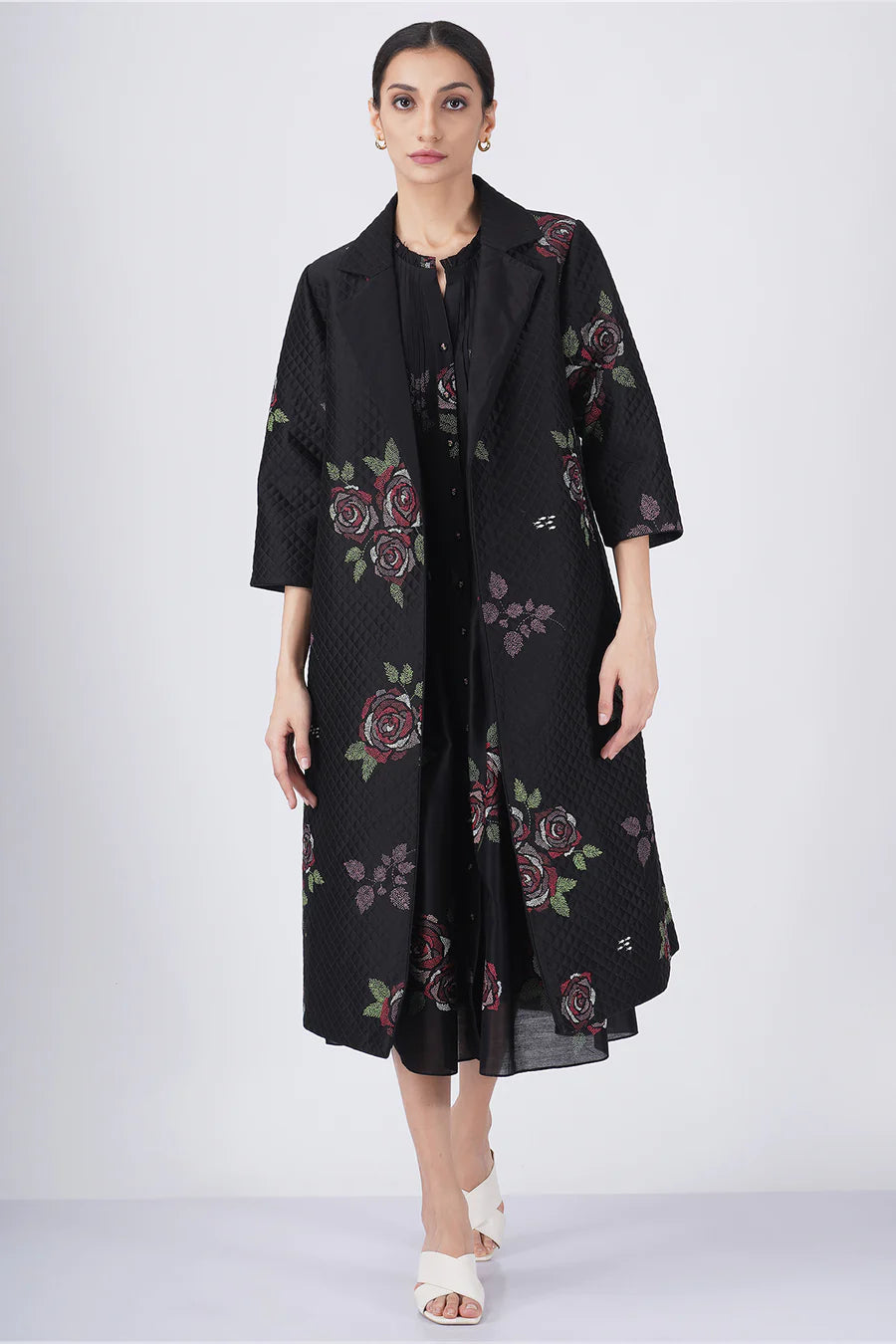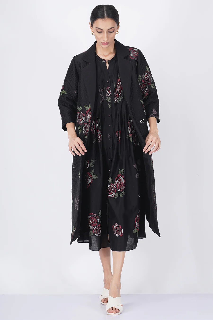 Multicolor Rose Print Pleated Dress With Multicolor Rose Printed Quilted Jacket