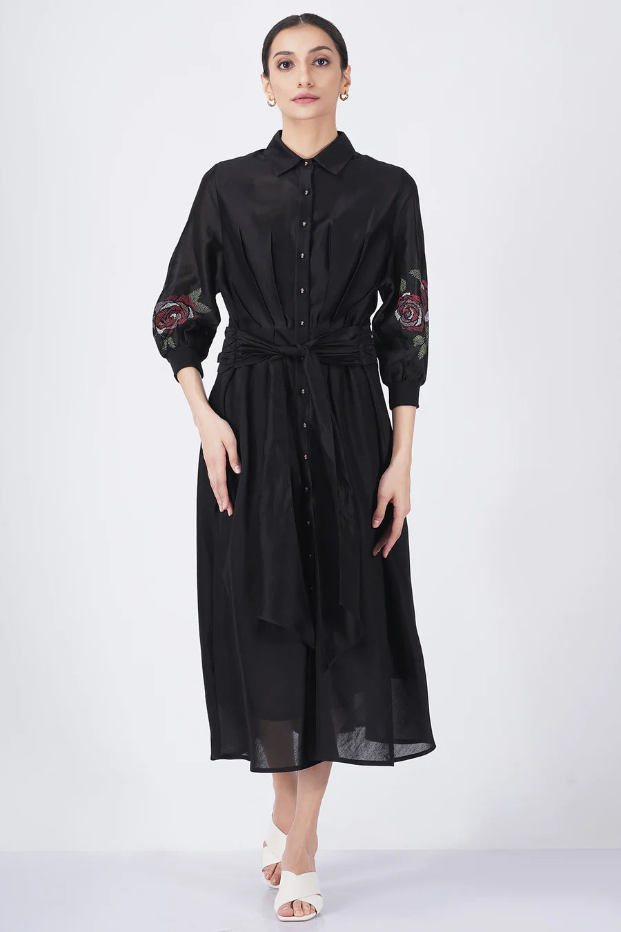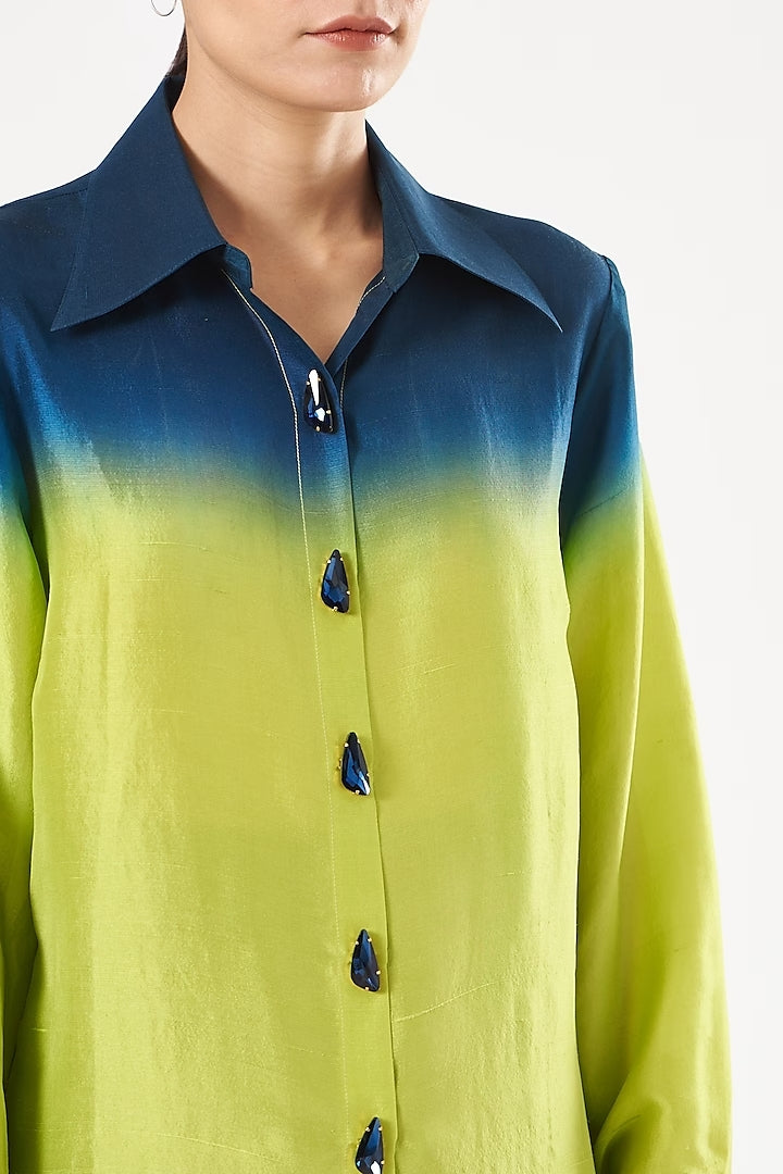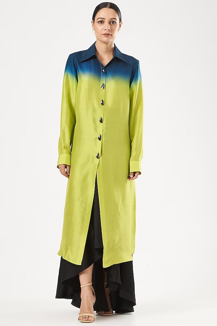 Ink Blue & Green Dupion Silk Maxi Shirt