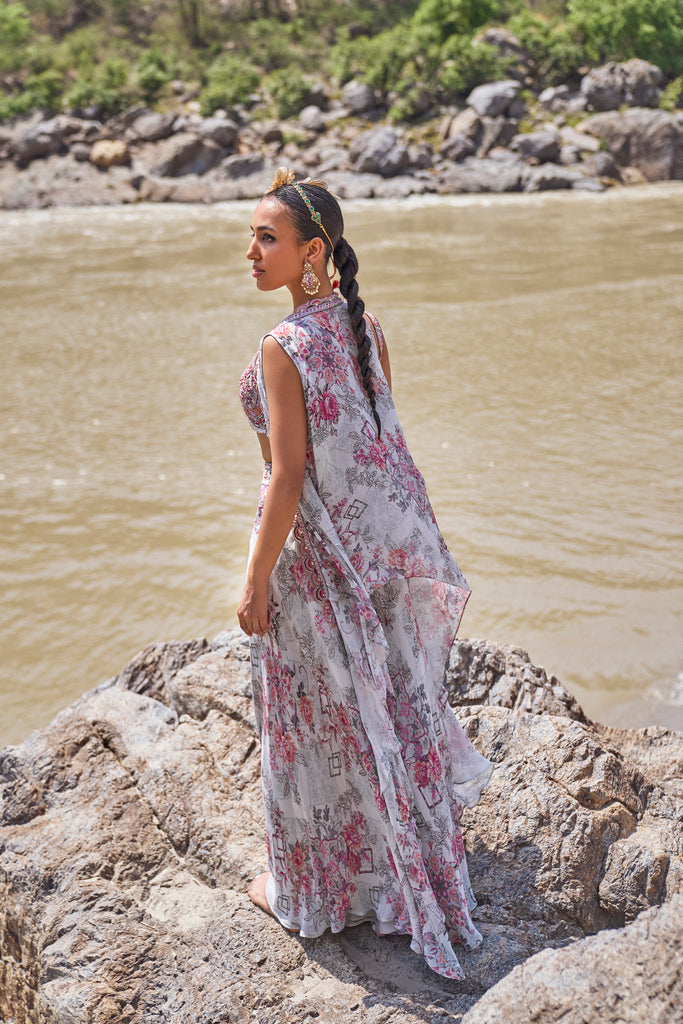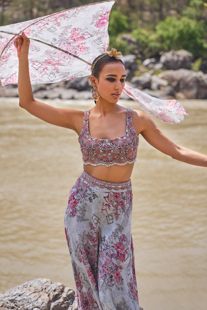 A refreshing style with this ensemble featuring a floral motif-embellished blouse, flared georgette palazzo, and a georgette cape with scallop detailing on the border. The vibrant patterns and free-flowing design make it the perfect choice to brighten your day
