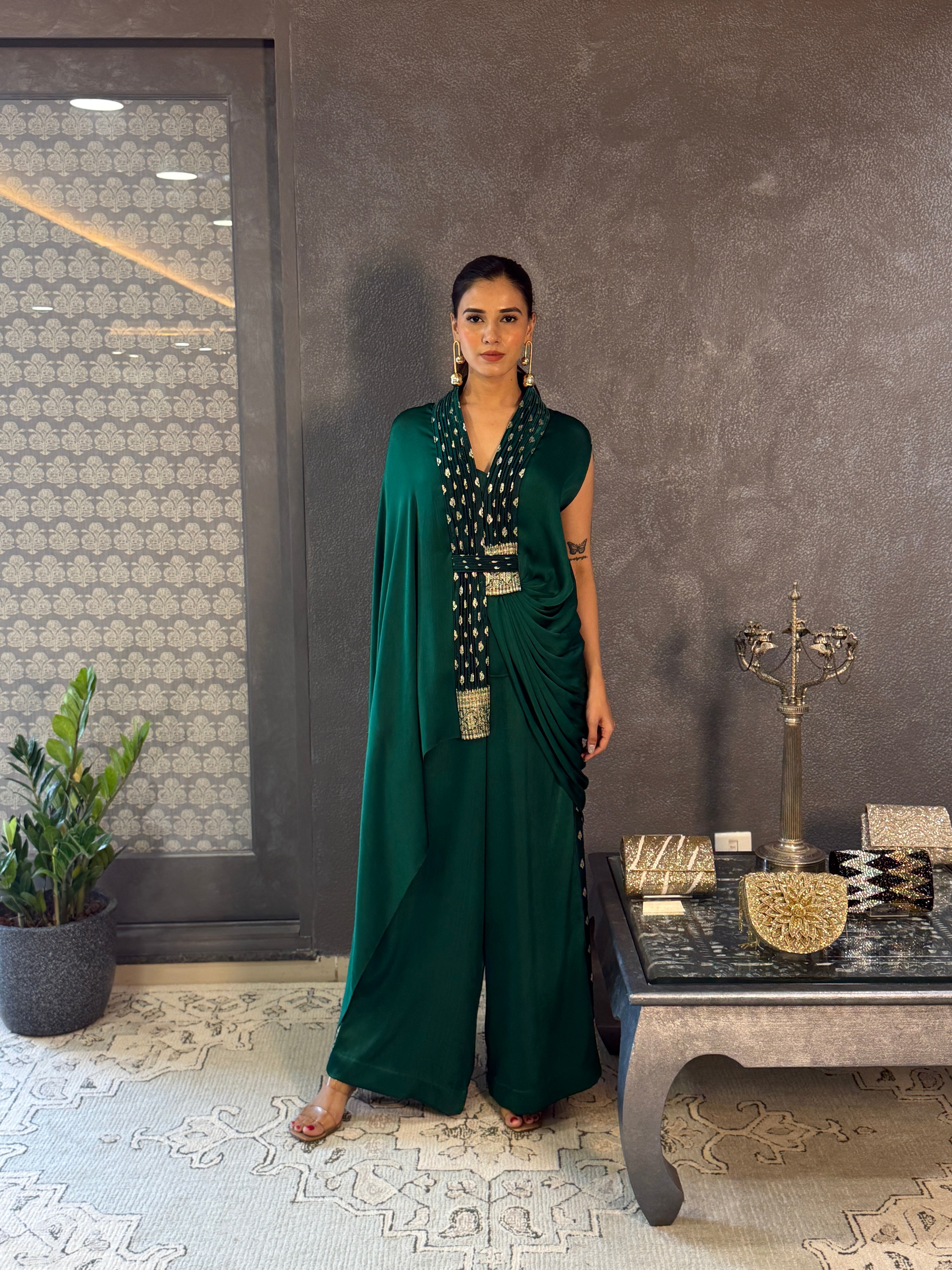 Emerald Green Satin Fluid Cape Set