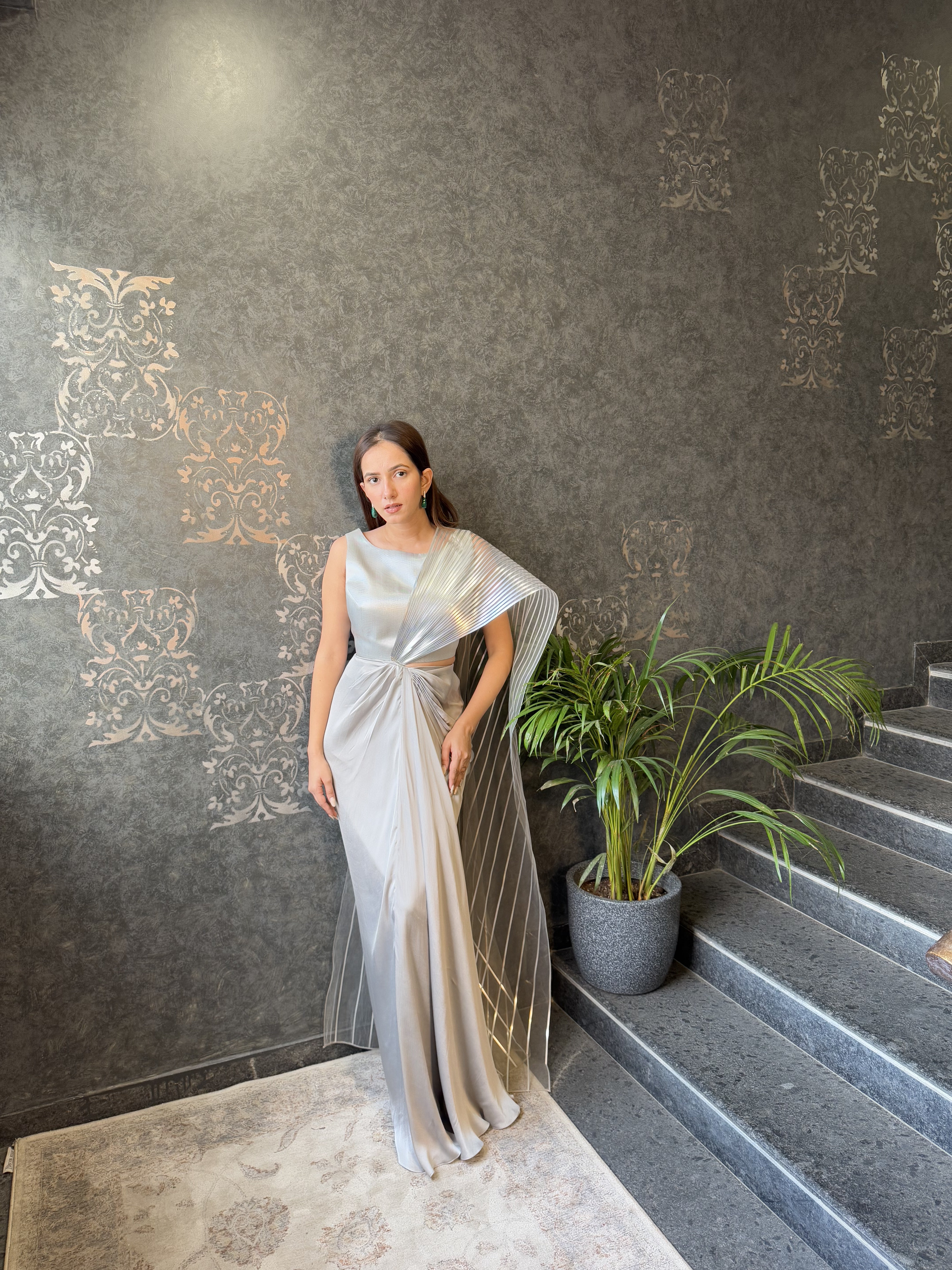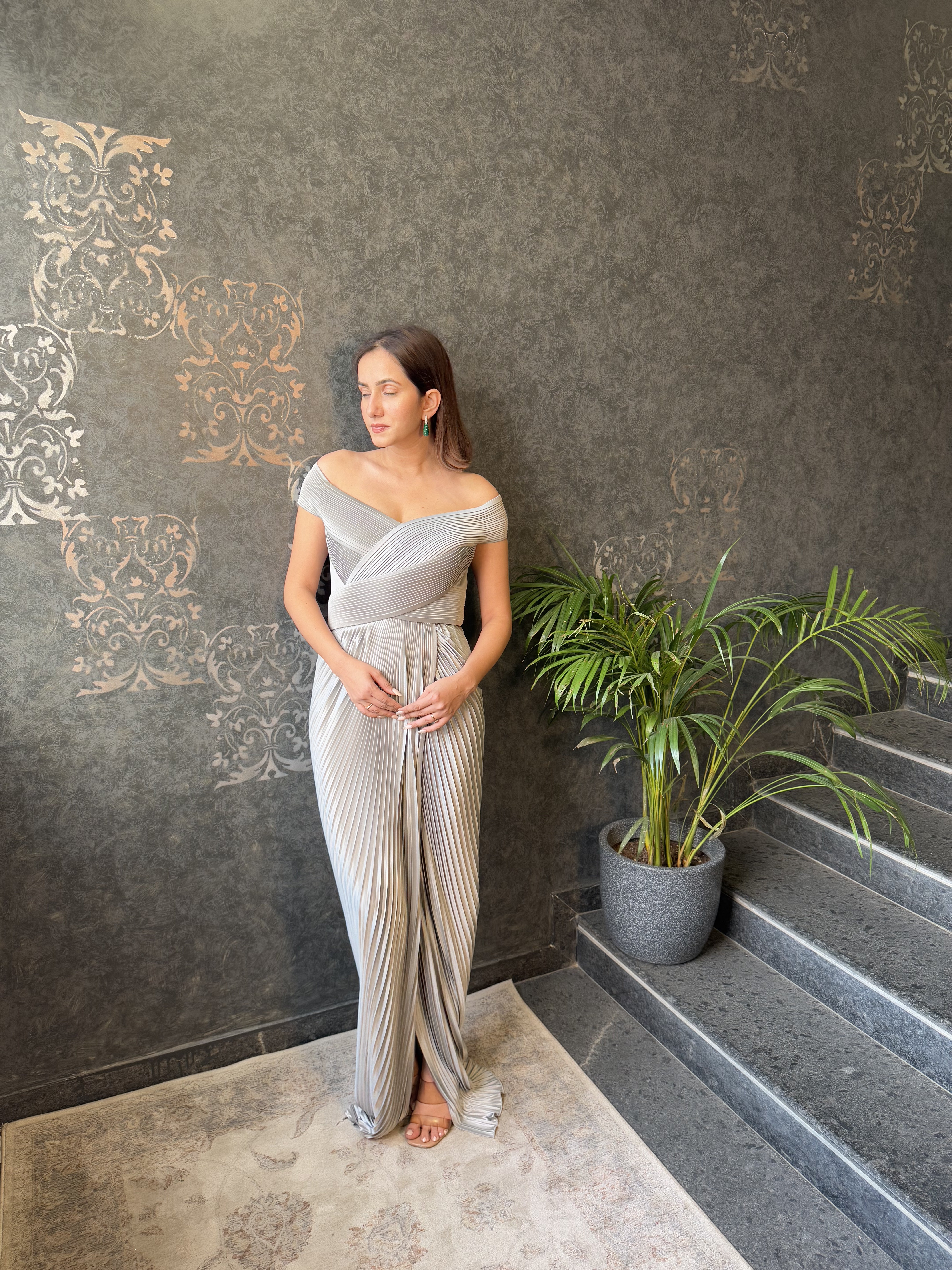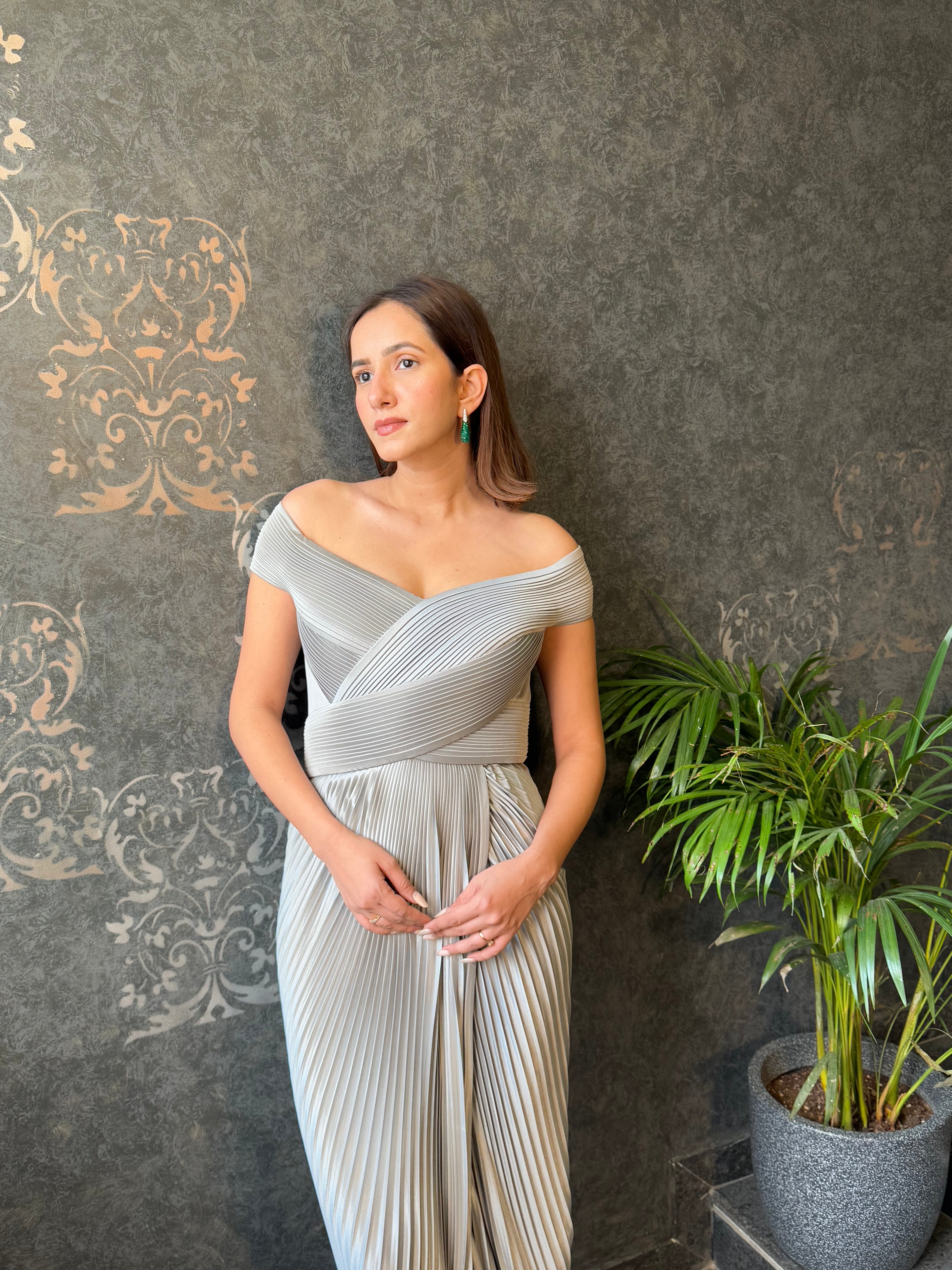 Mettalic Gret Structured Plisse' Gown
