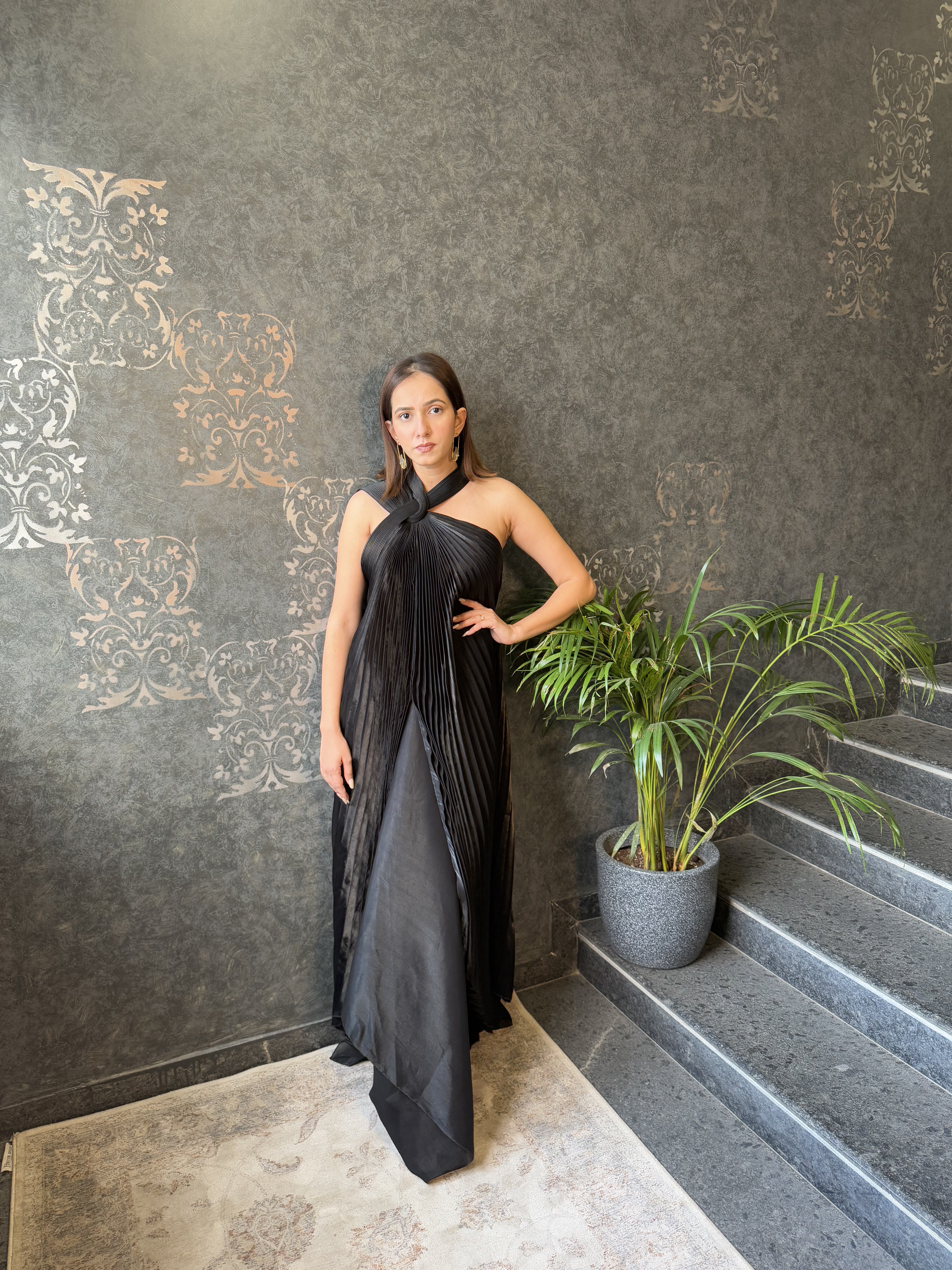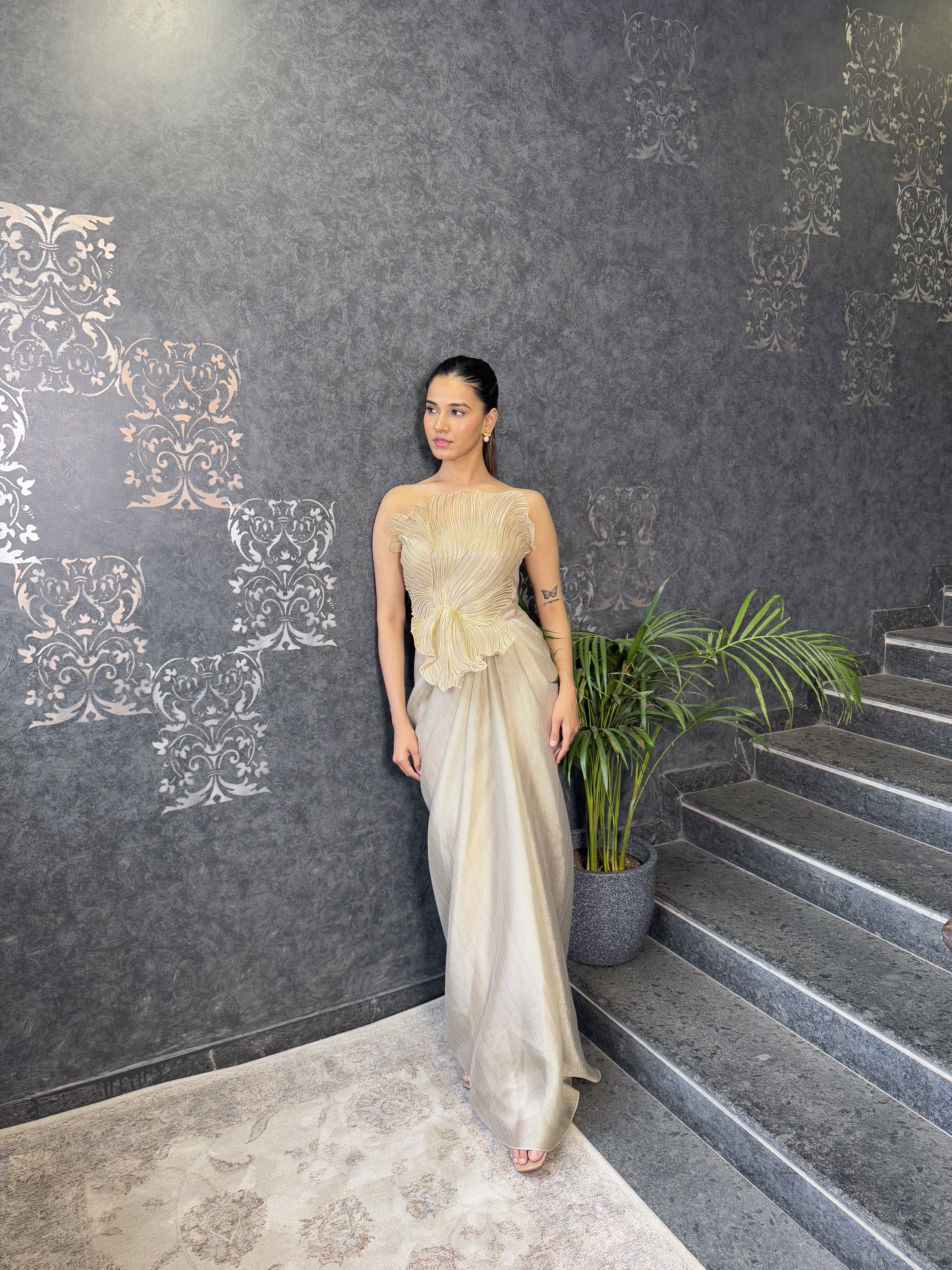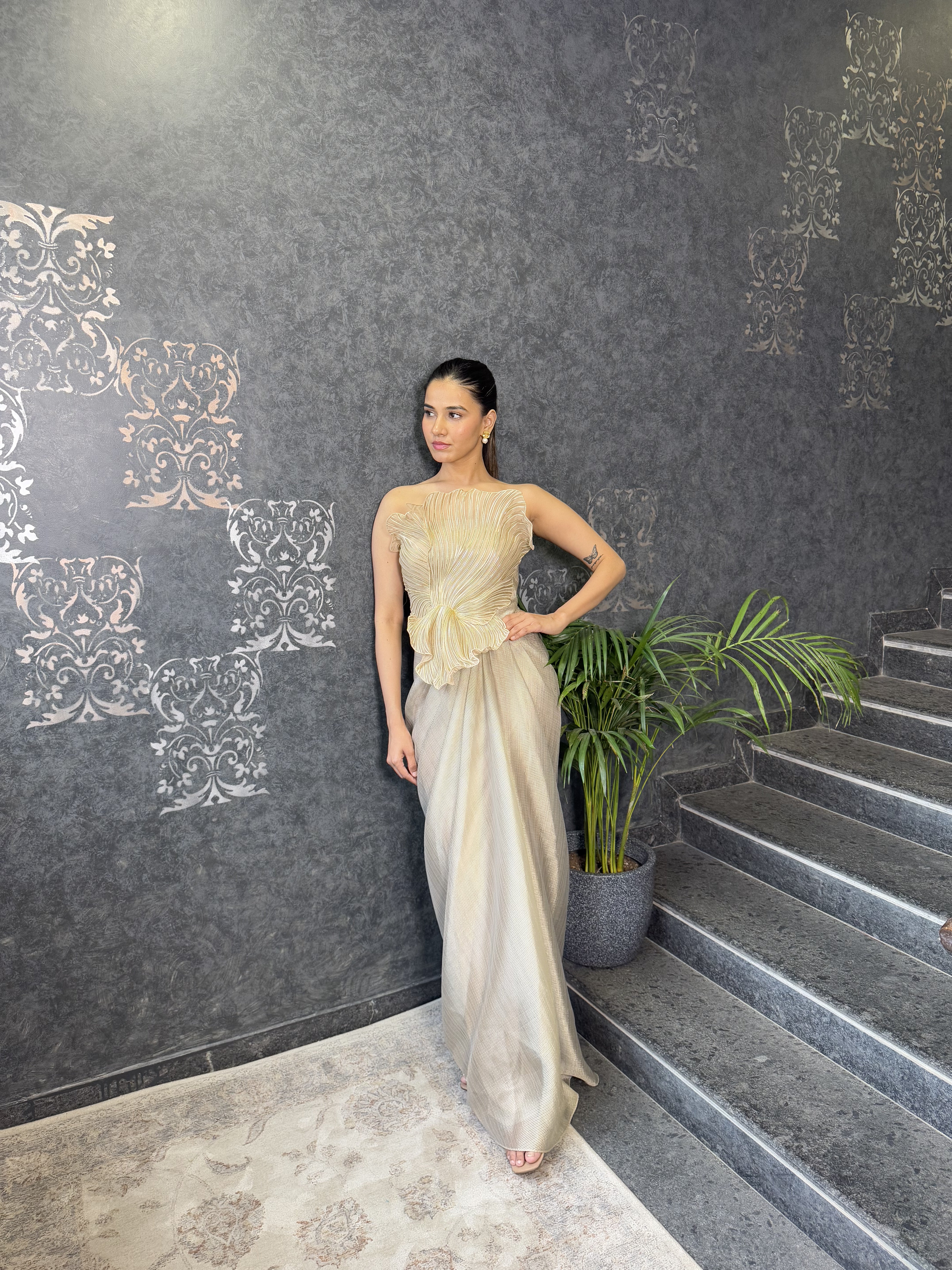Mettalic Gret Structured Plisse' Gown