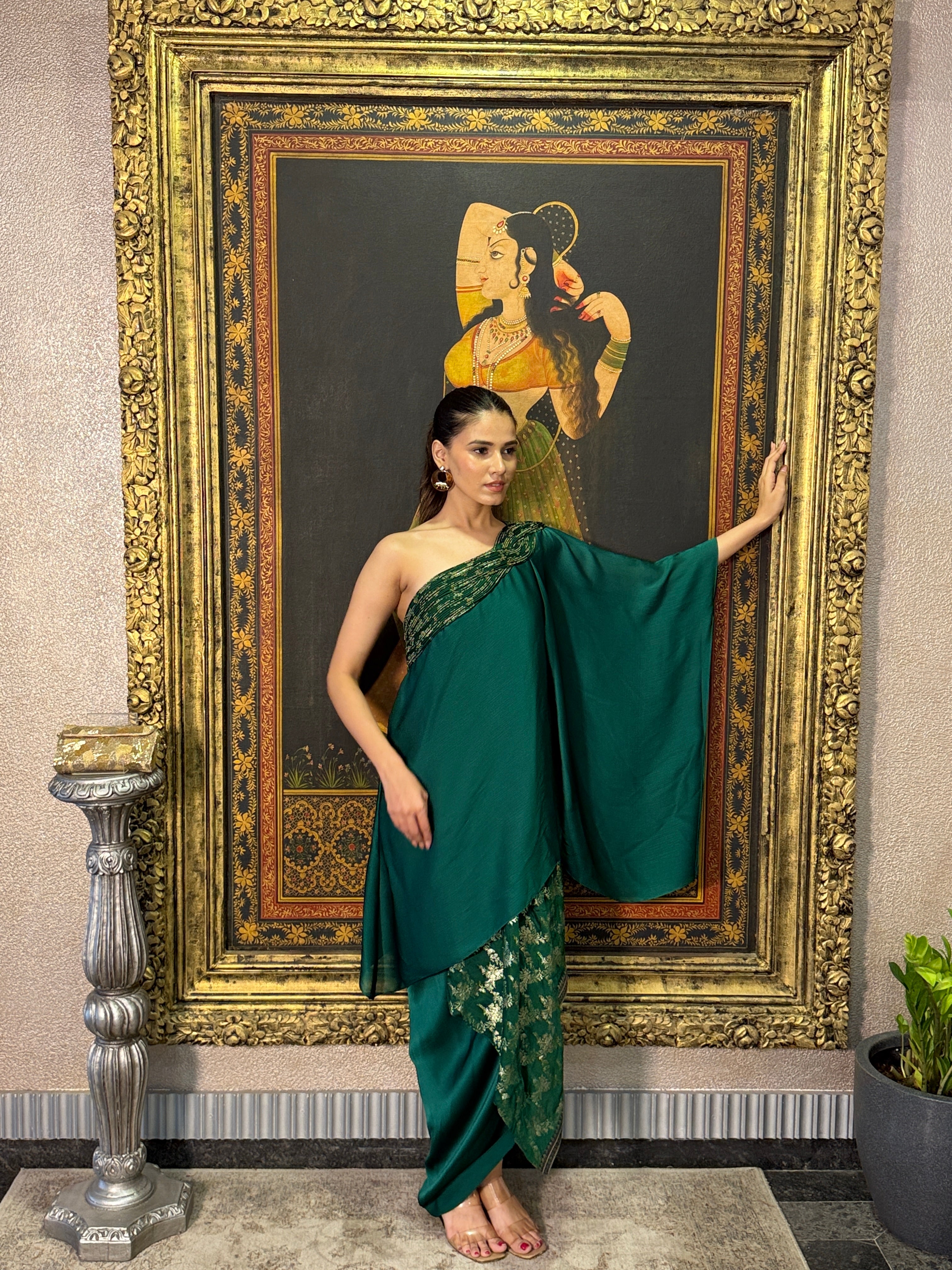 Emerald Banarasi Off- Shoulder Cape Set