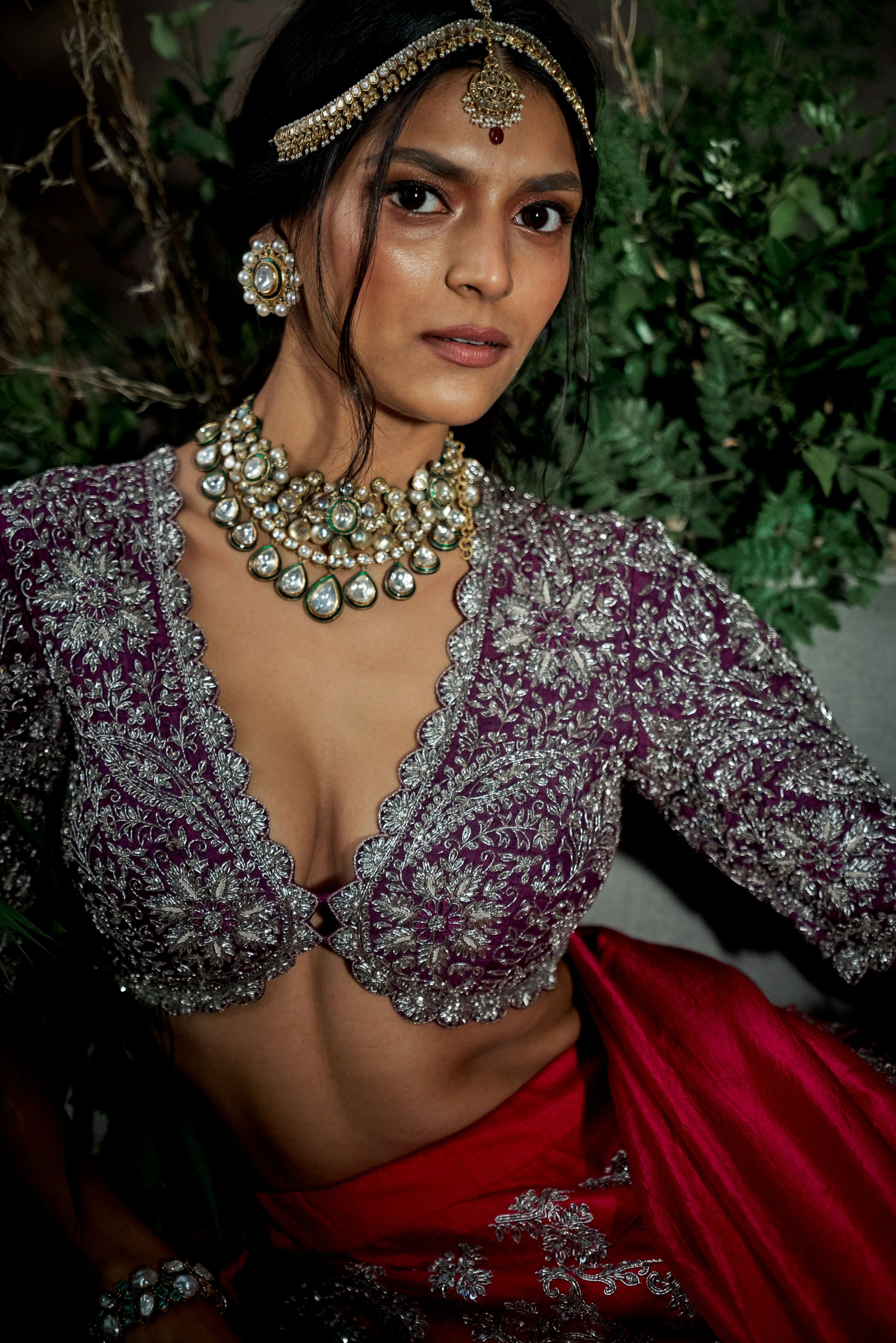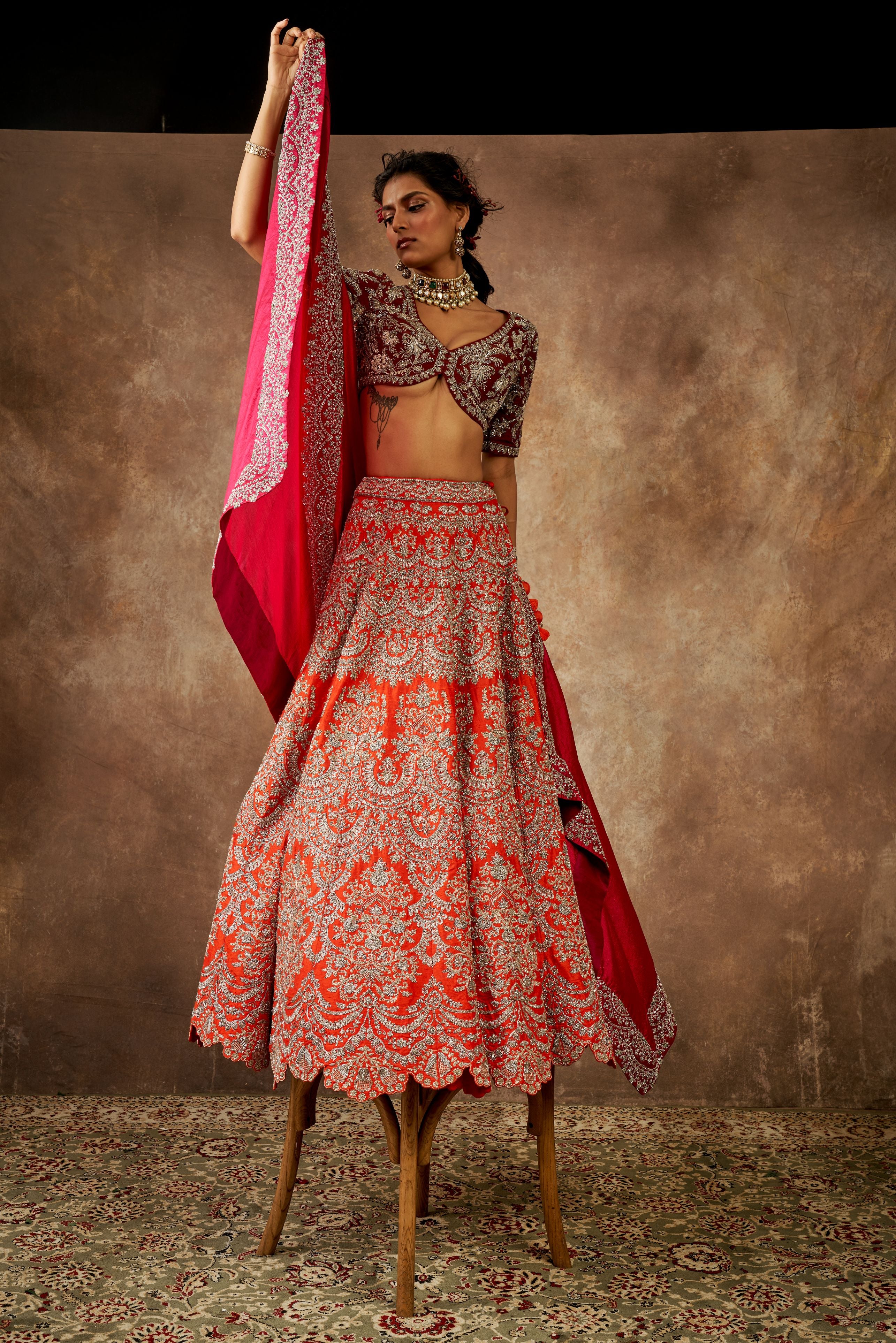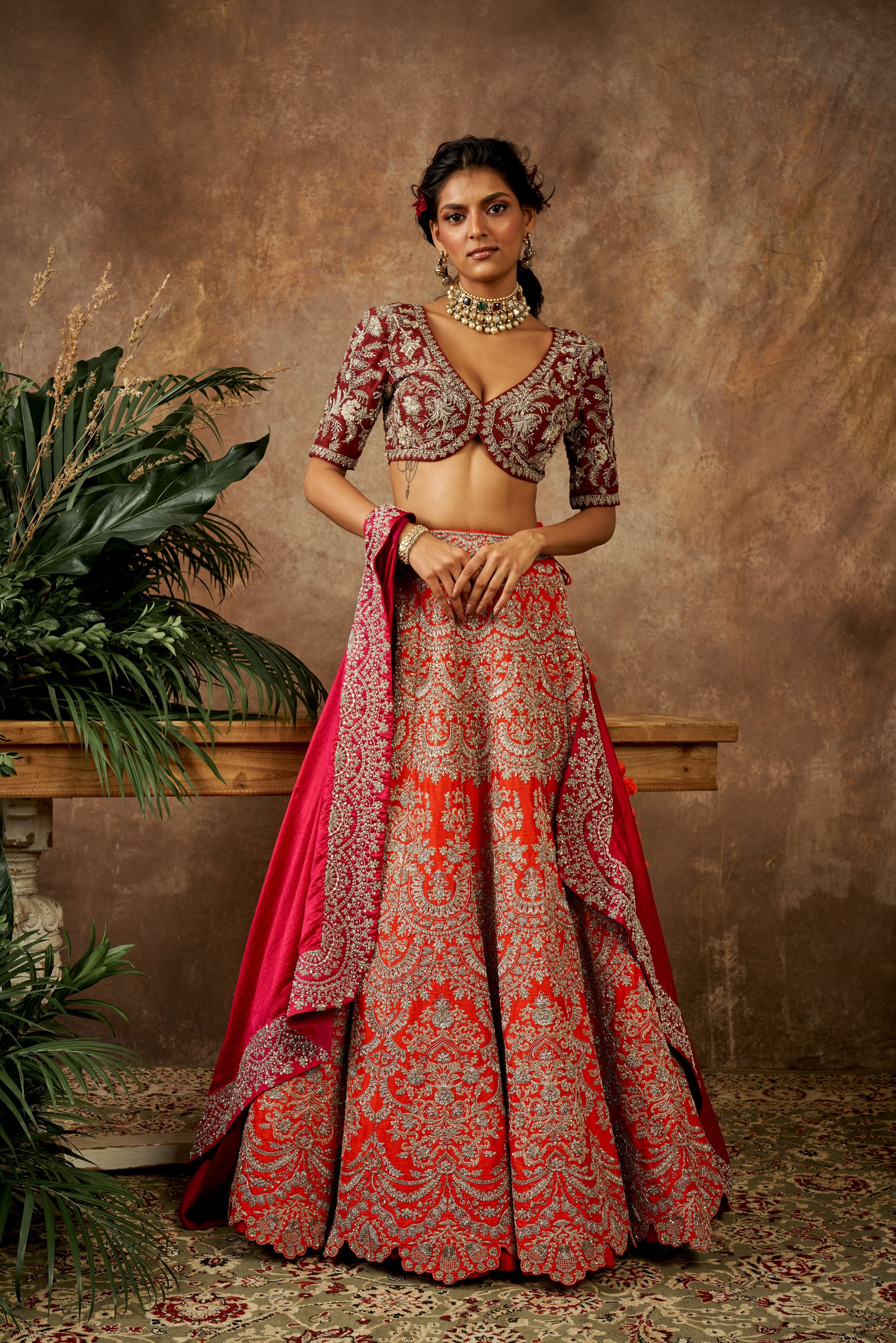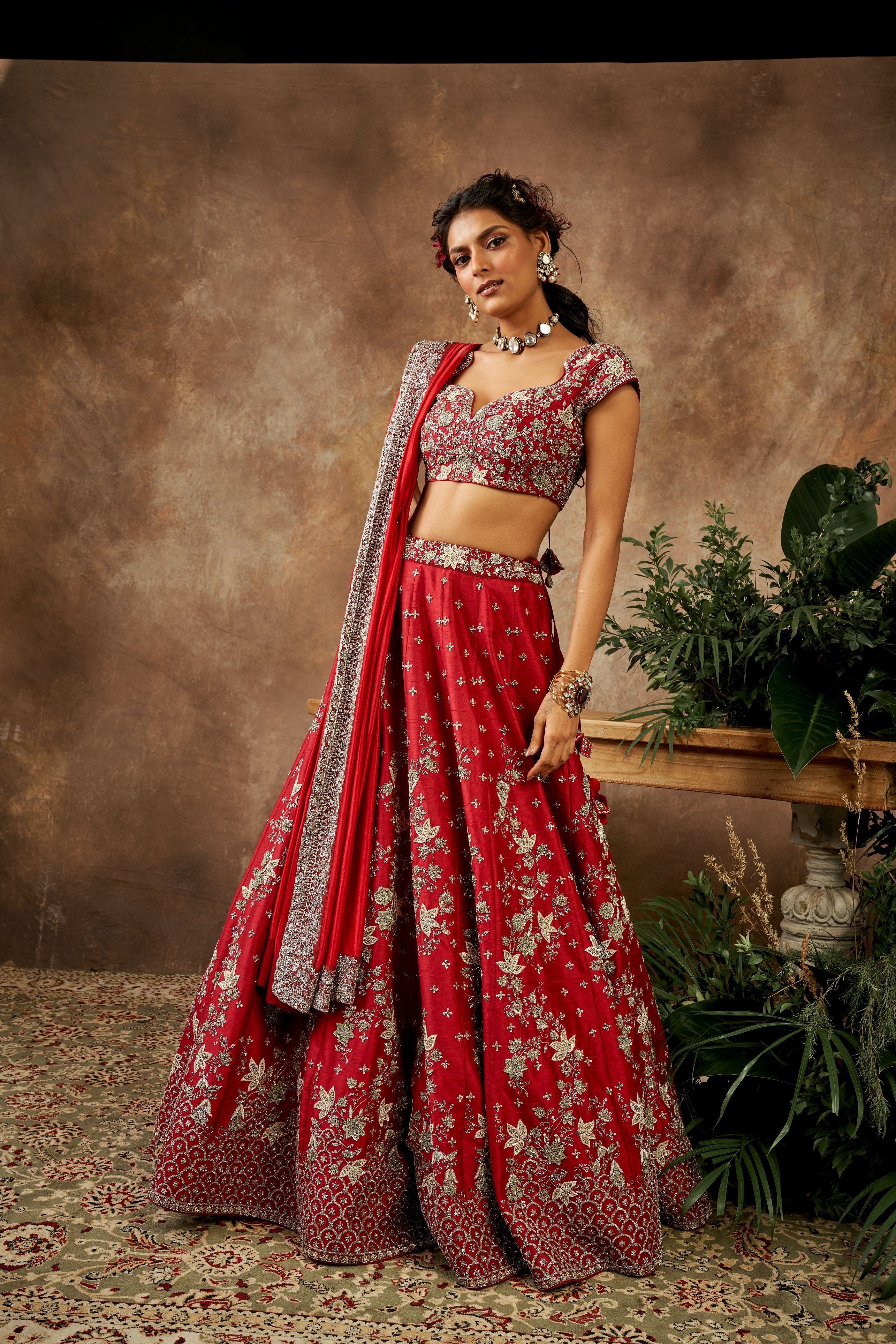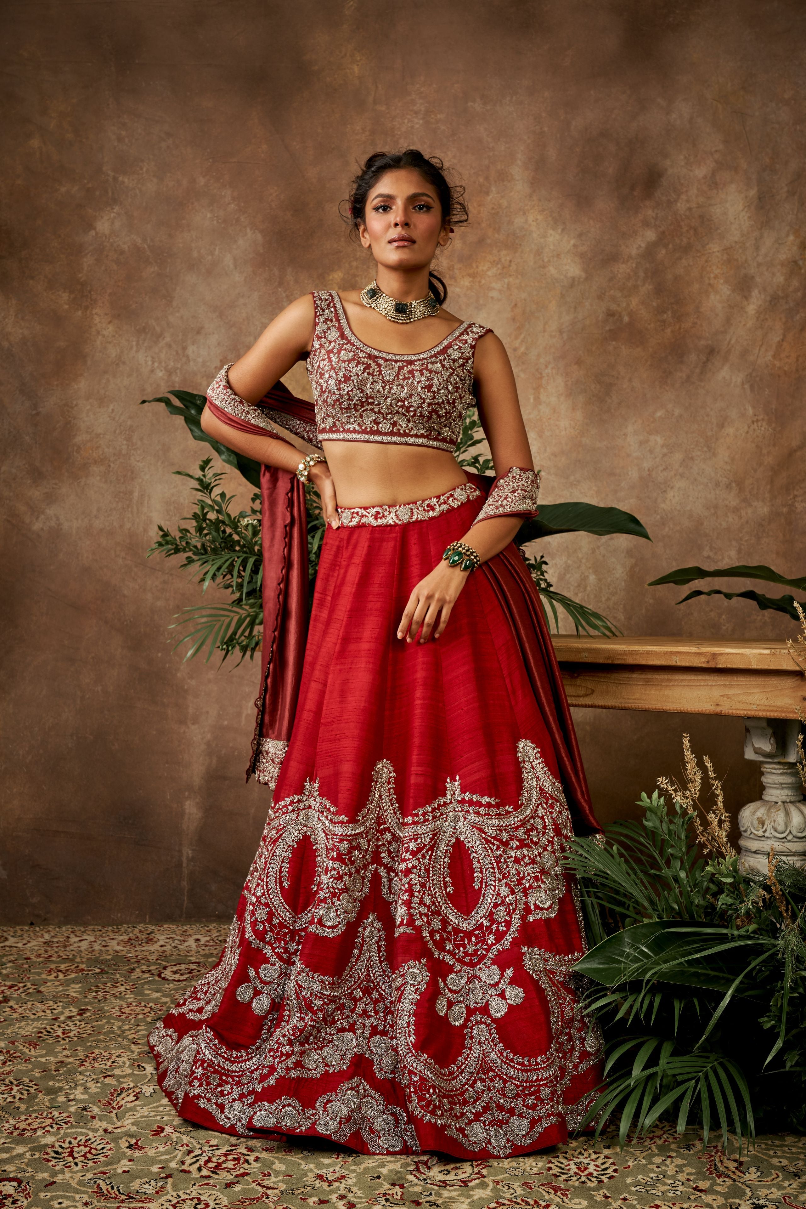 Red Raw Silk Zardosi Embroidered Lehenga Set