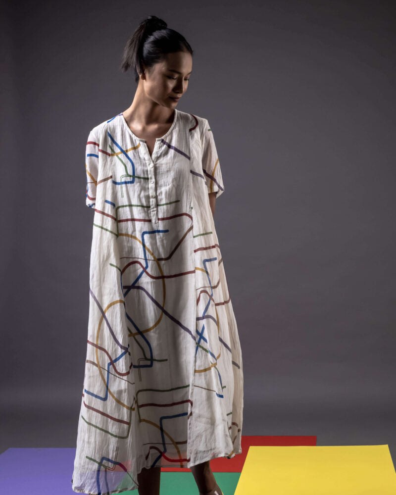 Dress has amoda’s MRT-track print. It is designed with a round neckline, center opening, handmade button placket, pocket on both sides and short sleeves. Finest hand-crafted machine stitch visible on neckline, sleeves, joints and bottom hem.