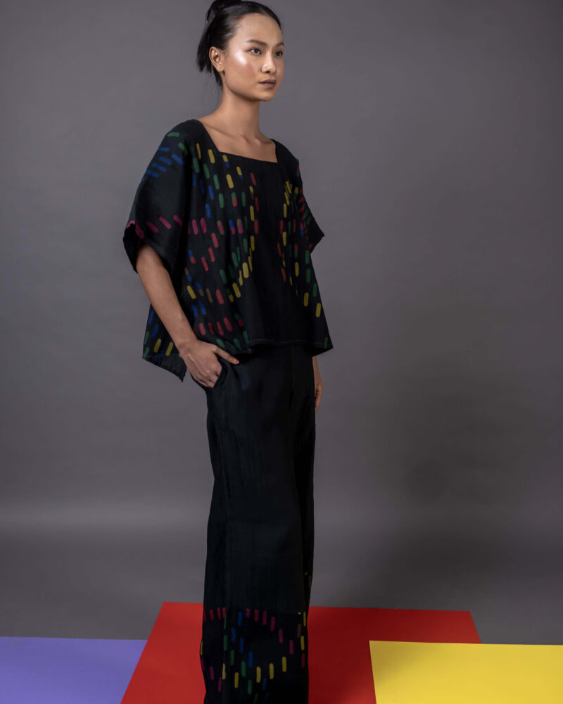 PRODUCT DESCRIPTION:Palazzo (B-STN) has amoda’s MRT-track textile print. Have an elastic waistband and flat front at the waist.