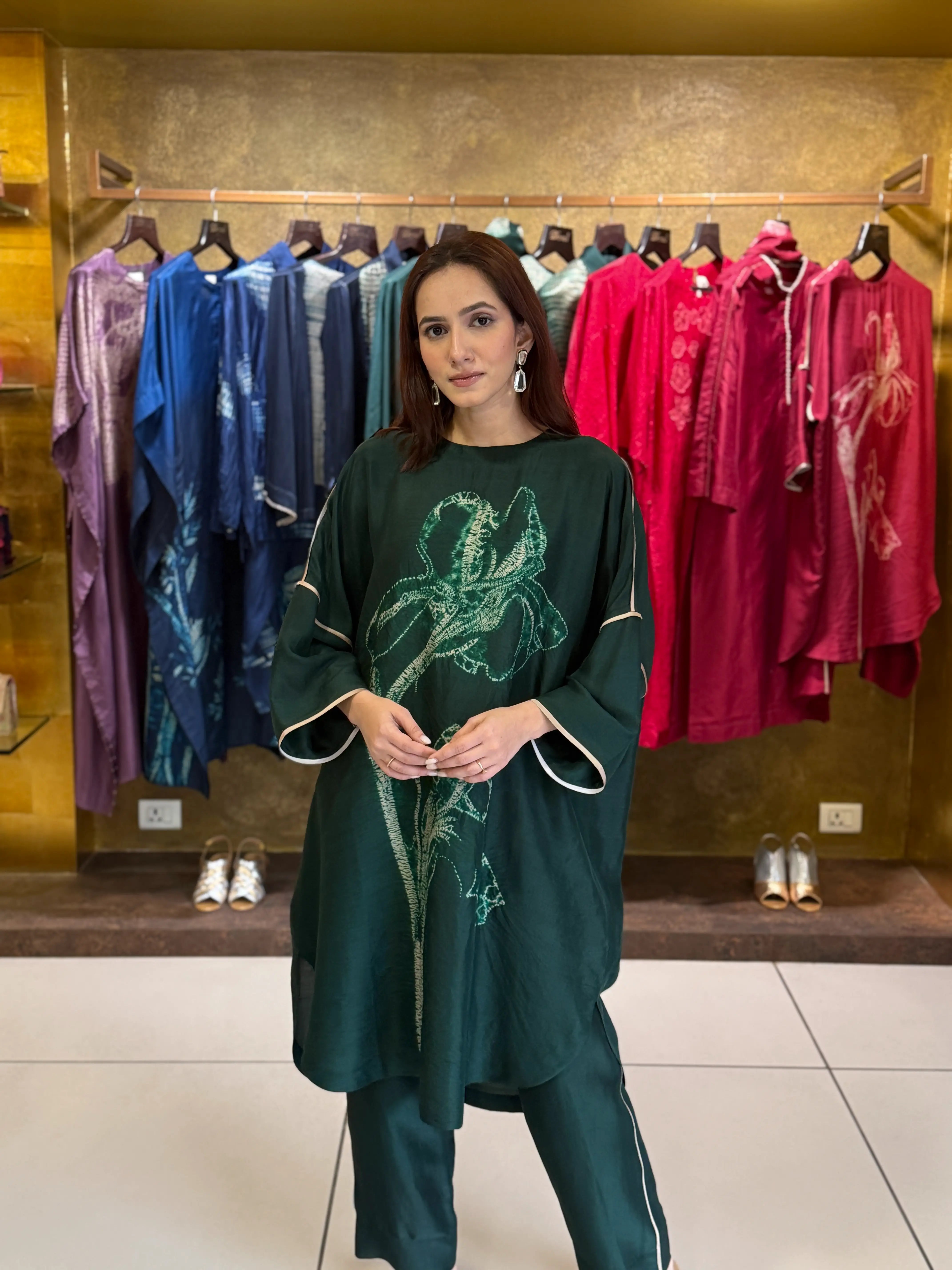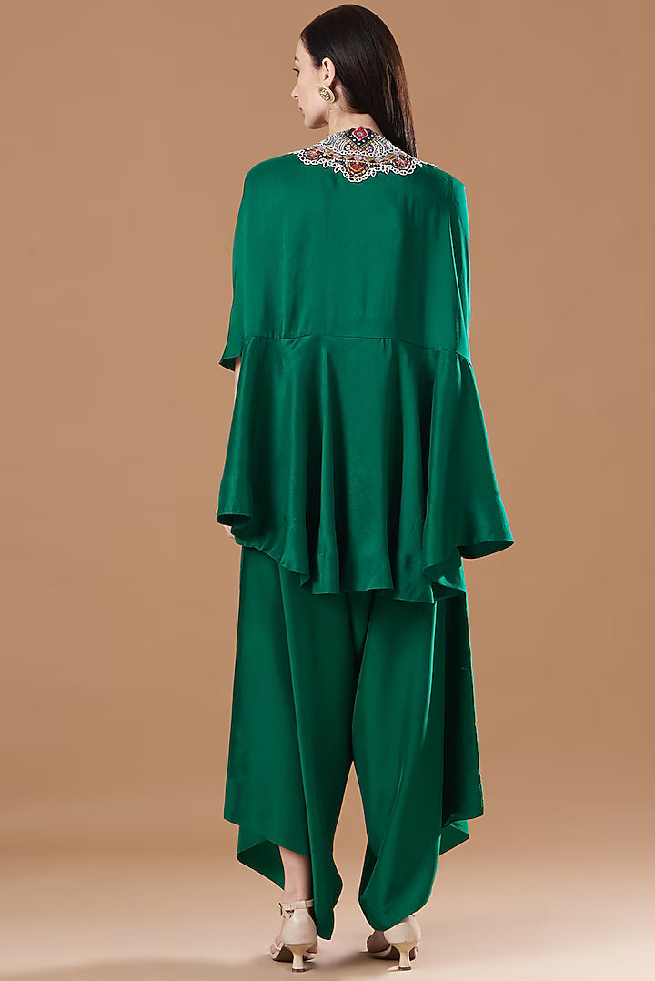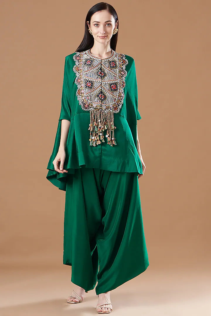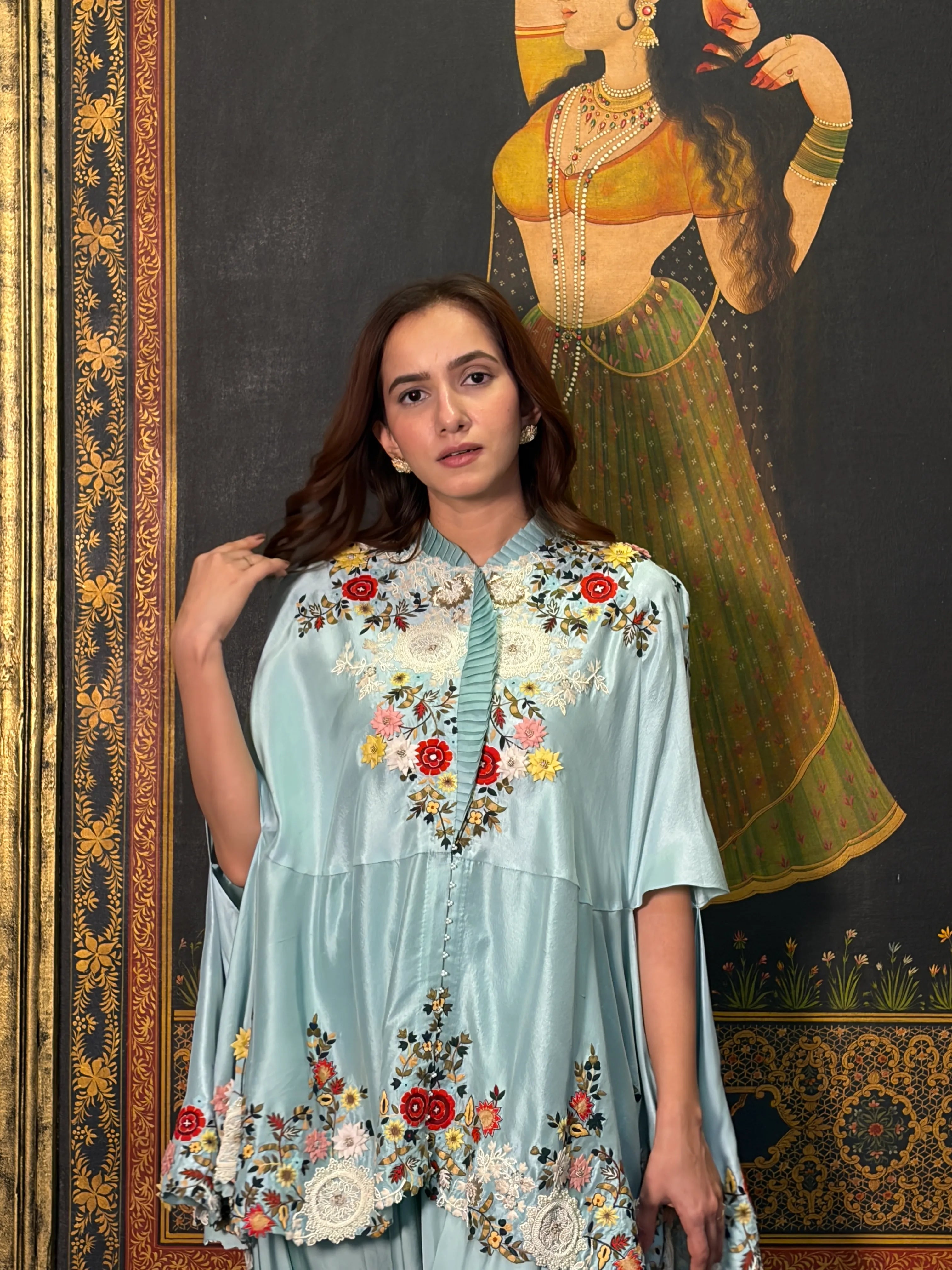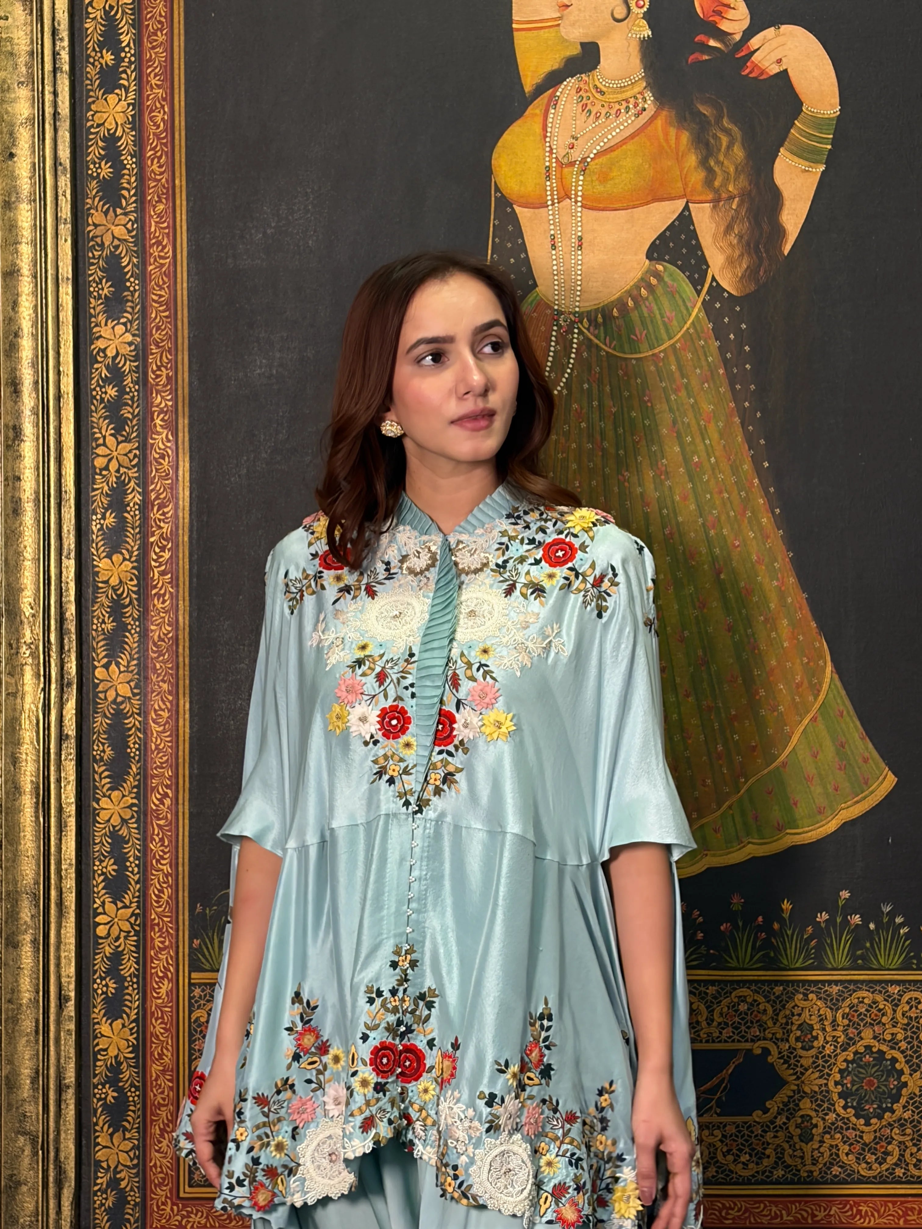 The shirt features a clean, plunging neckline and delicate hand-embroidered Flower appliqués in monochrome tones on the shoulders.