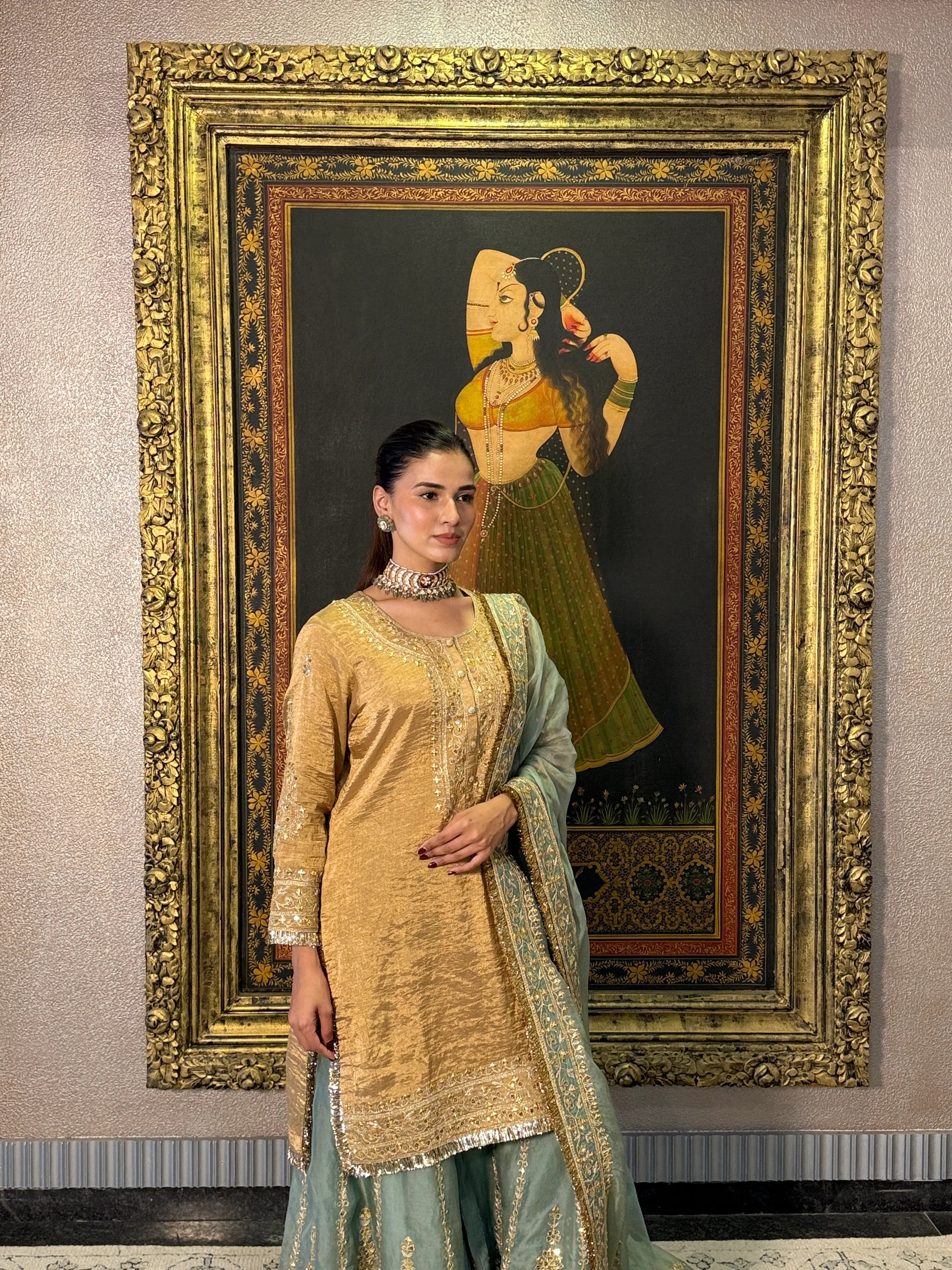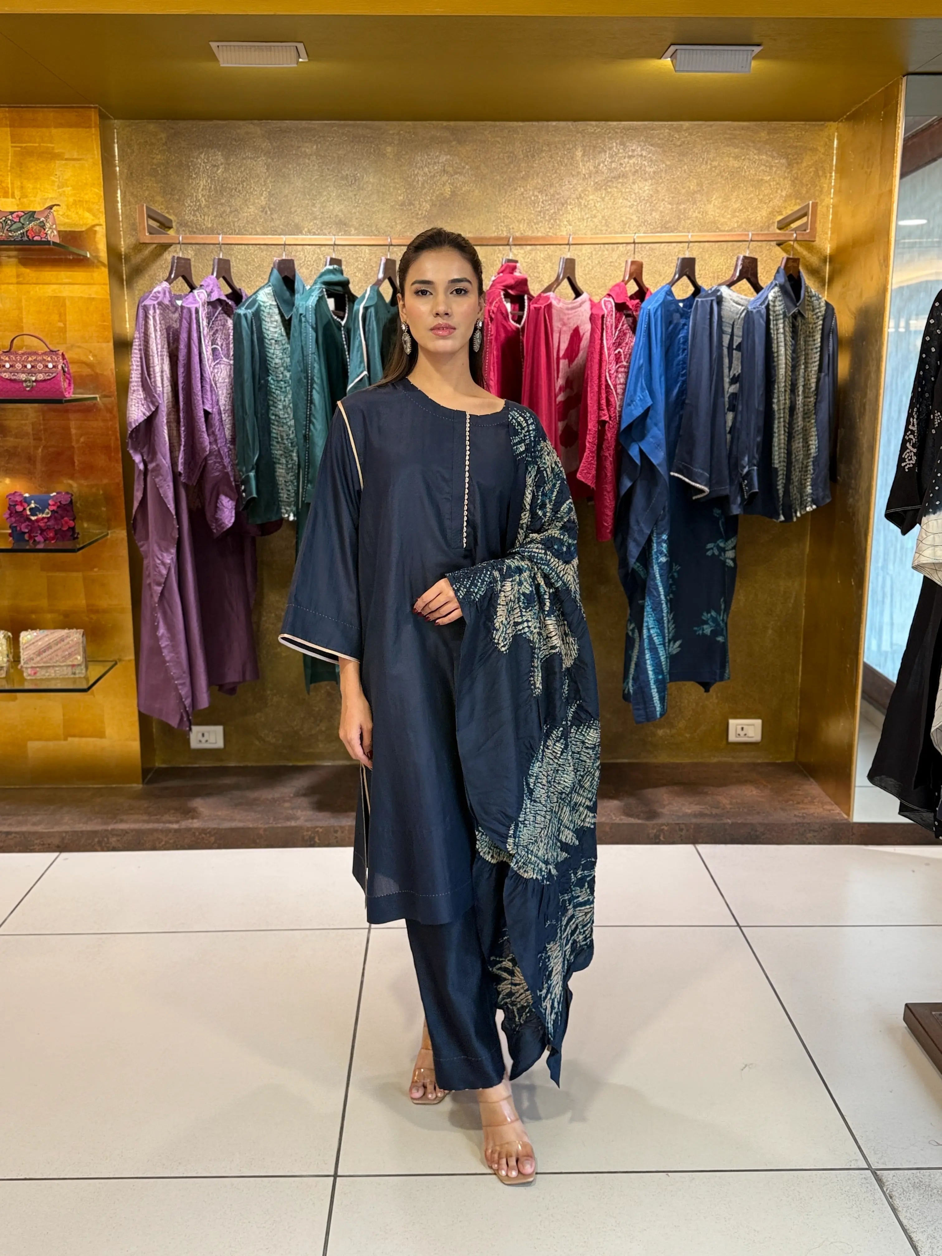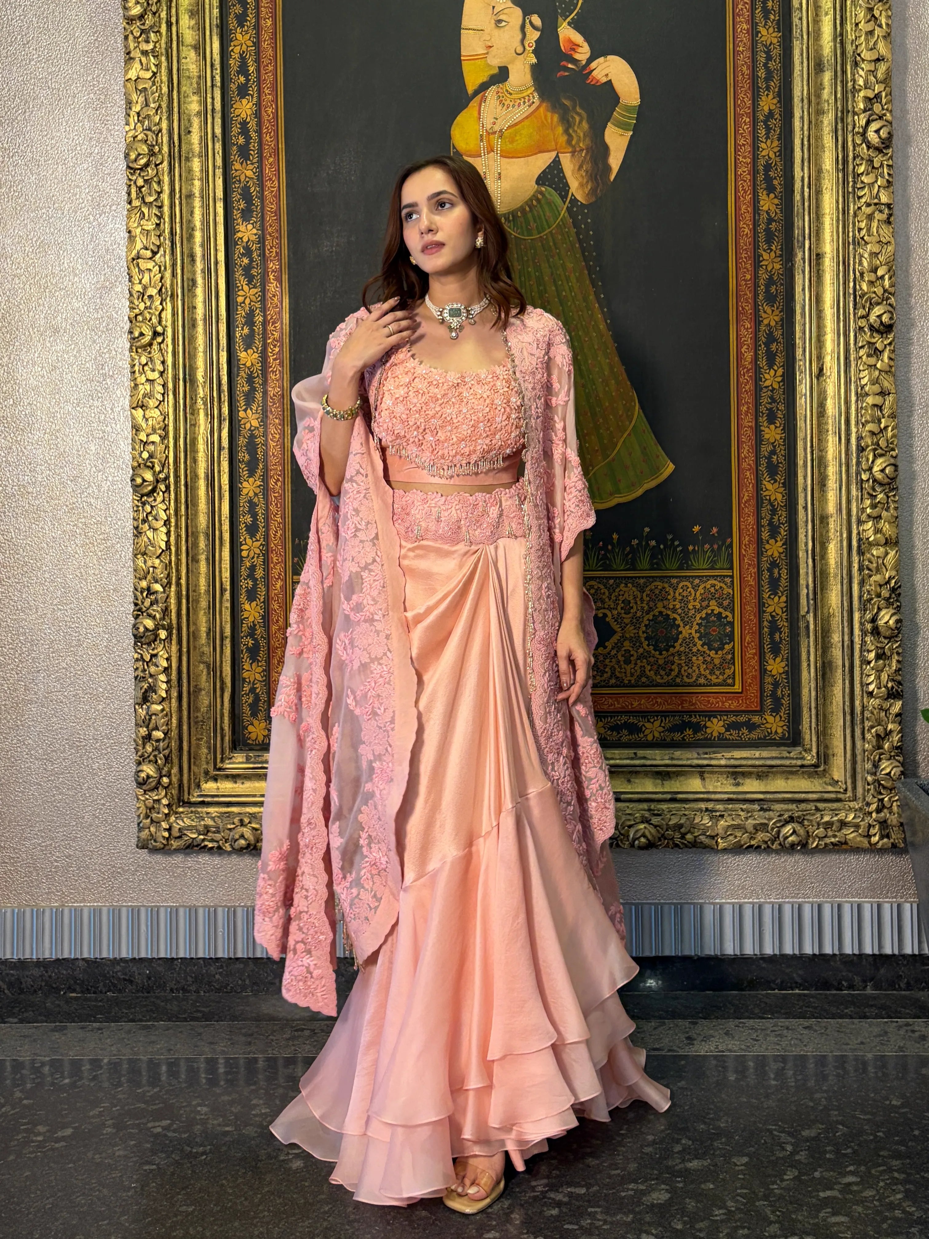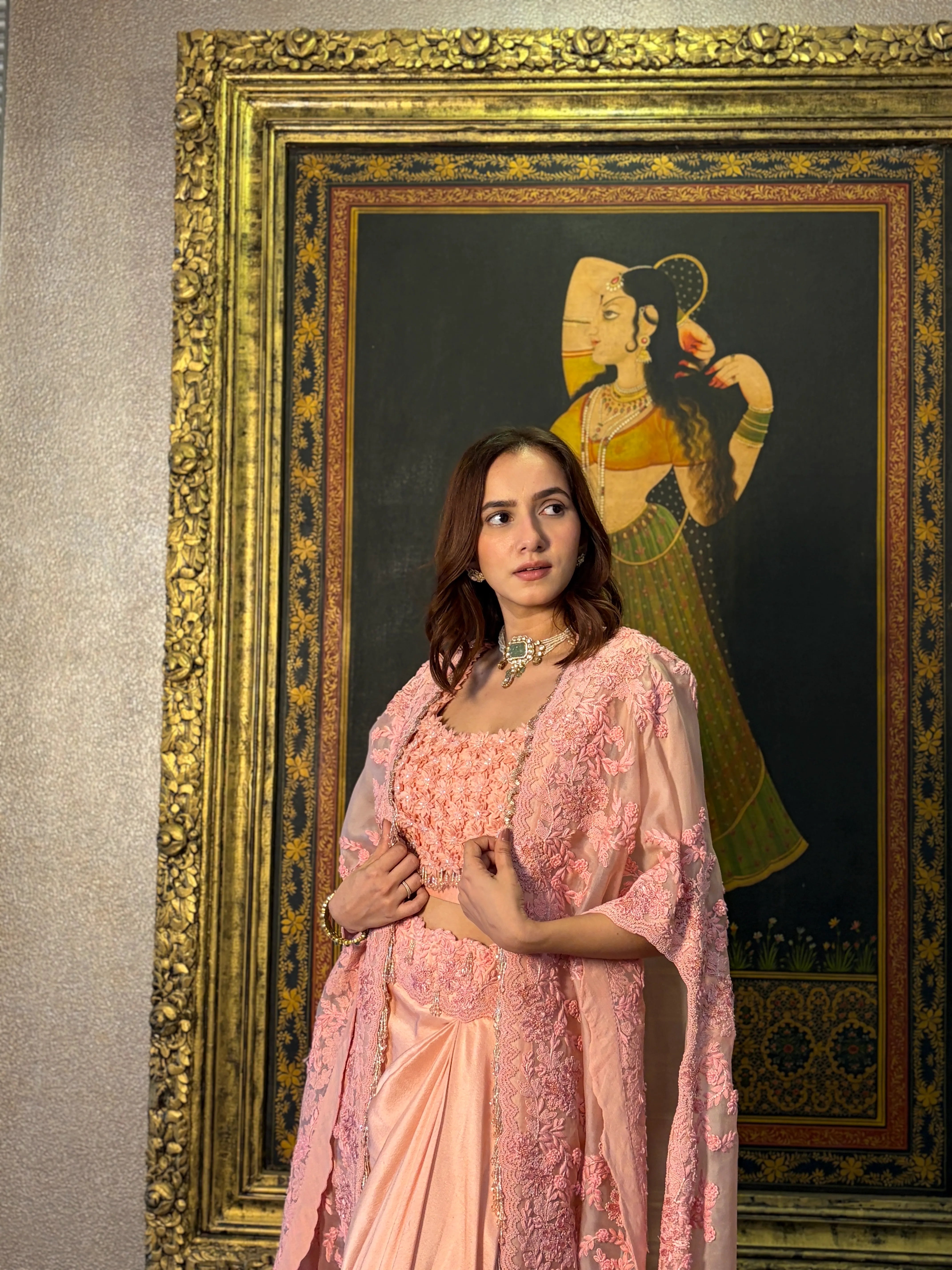The shirt features a clean, plunging neckline and delicate hand-embroidered Flower appliqués in monochrome tones on the shoulders.