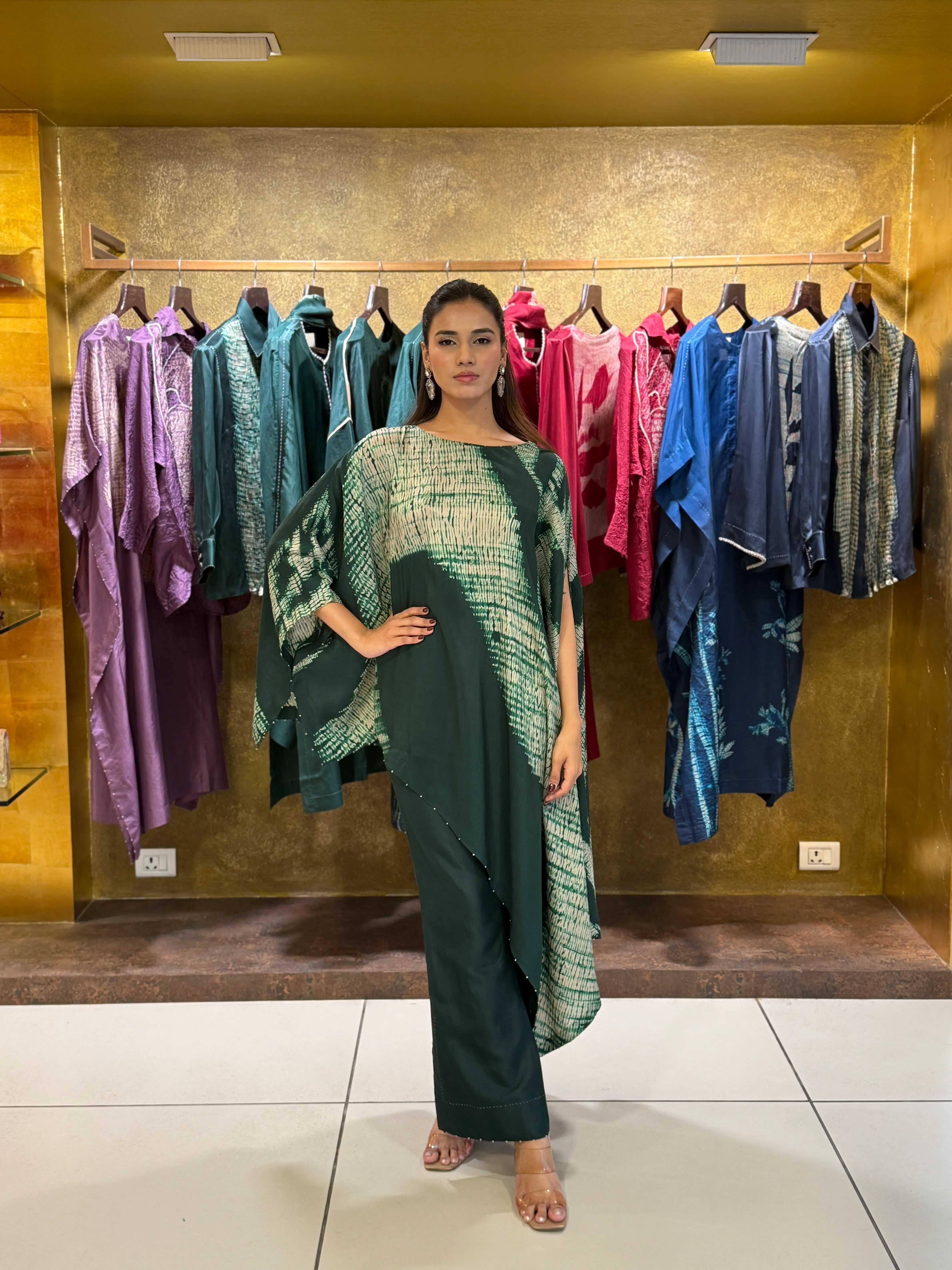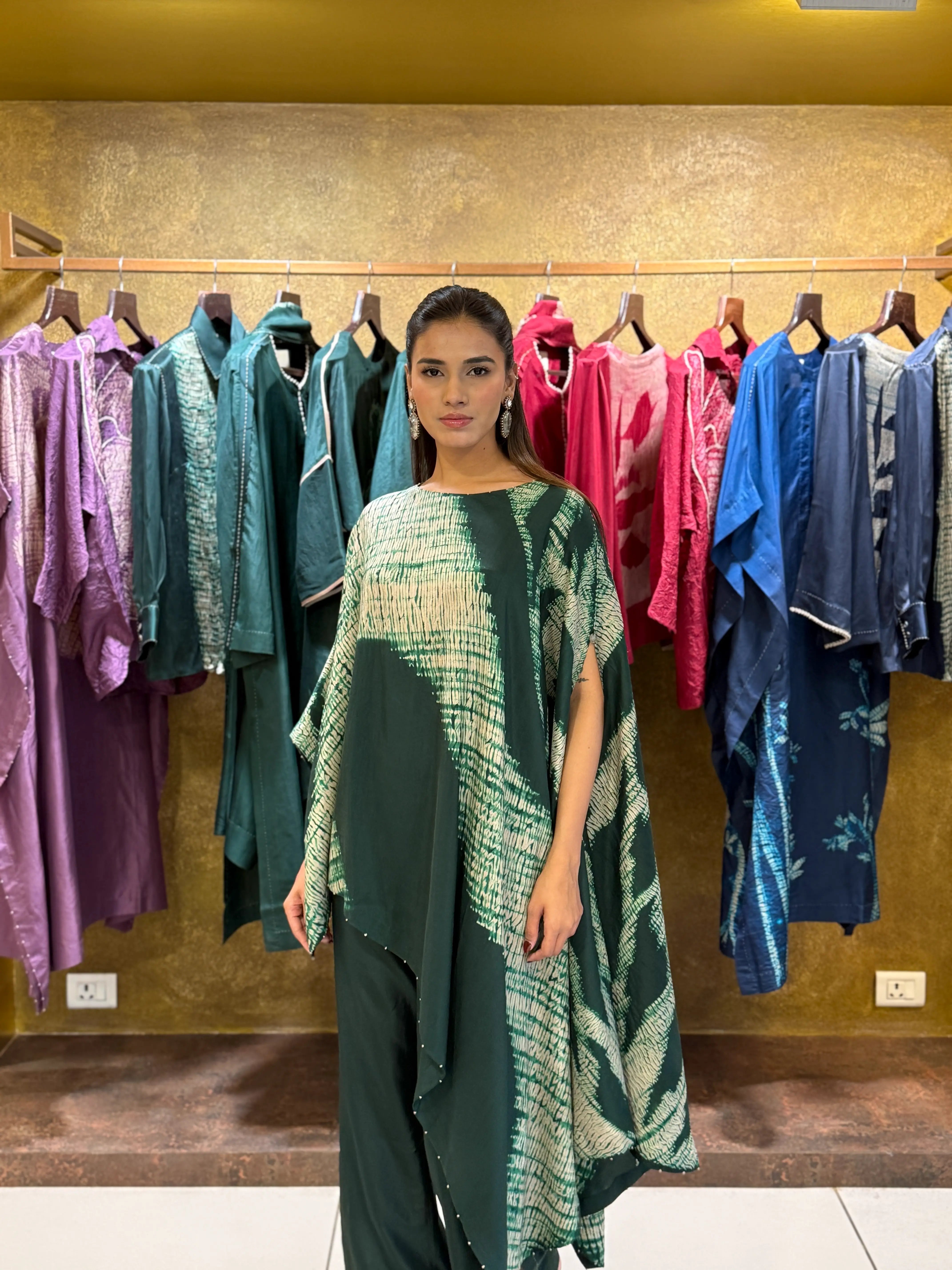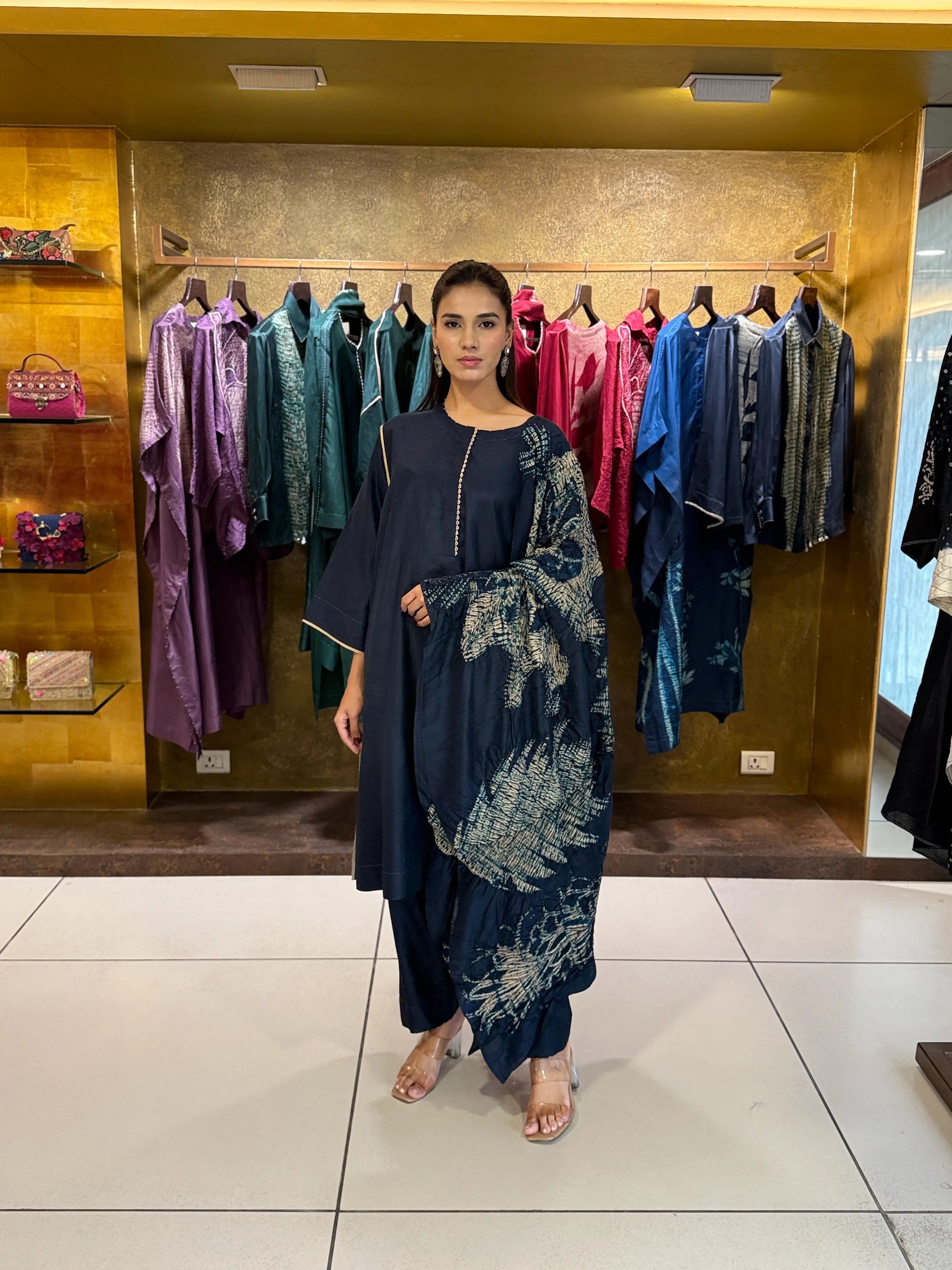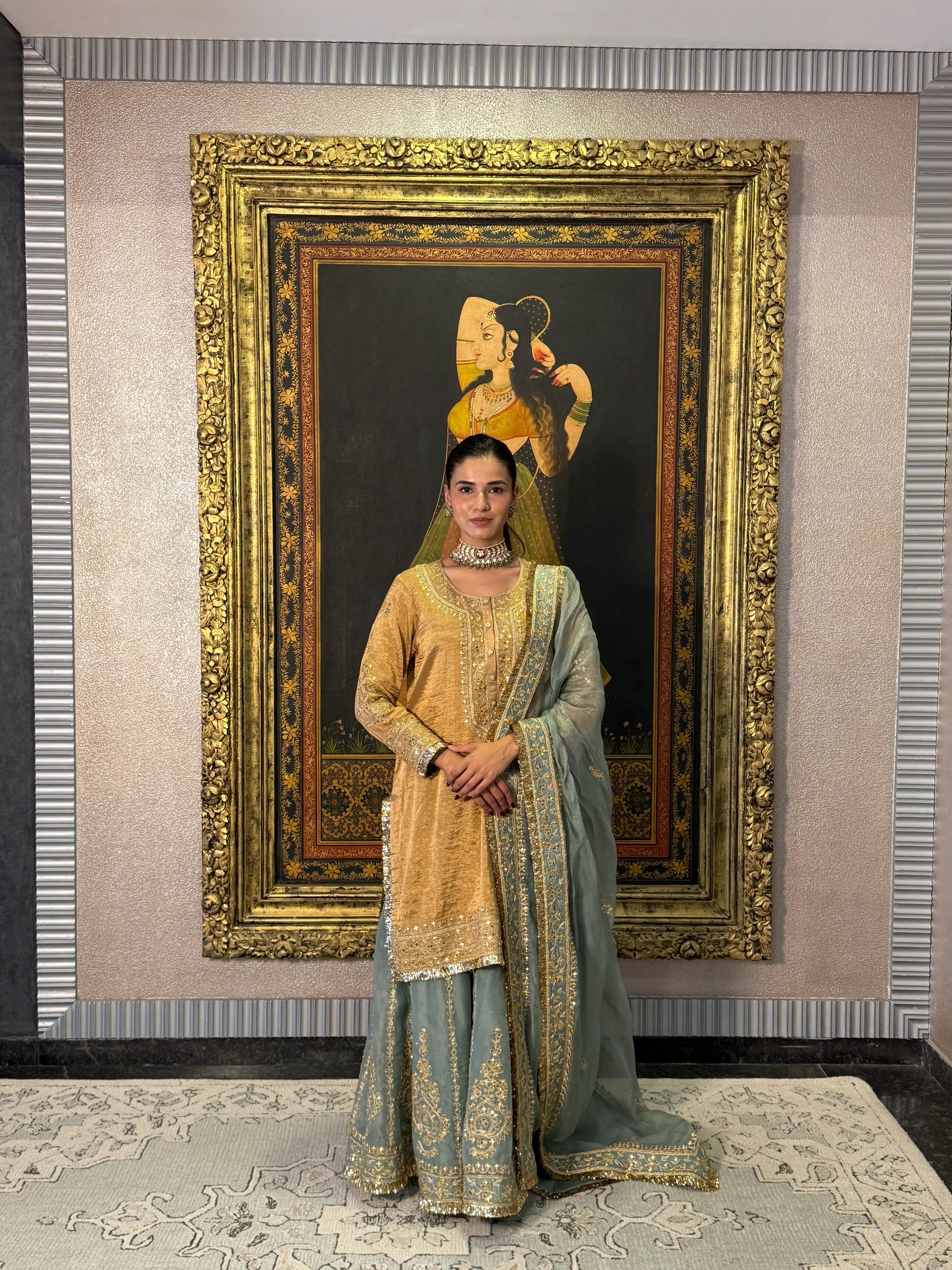 The shirt features a clean, plunging neckline and delicate hand-embroidered Flower appliqués in monochrome tones on the shoulders.