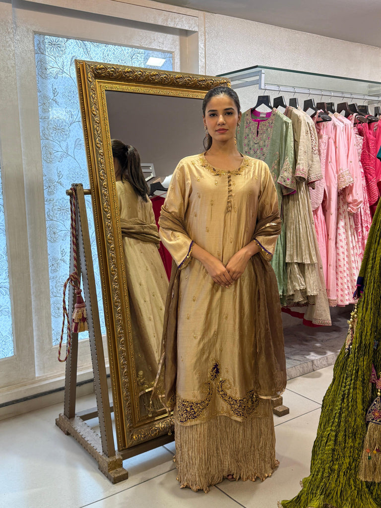 This 3 piece kurta set with attached crush skirt features heavily embroidered velvet applique paisley at the hem and butis spread all over the kurta.