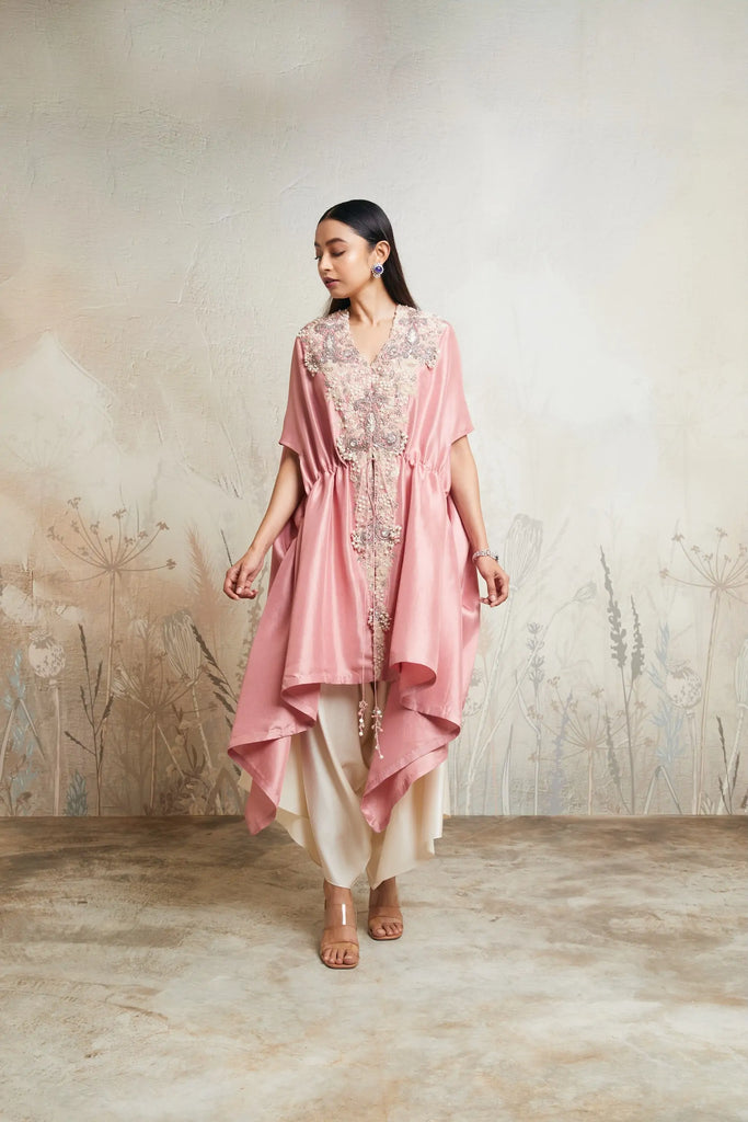 Resham and maal work on Silk pull dori kaftaan with Cotton satin pant